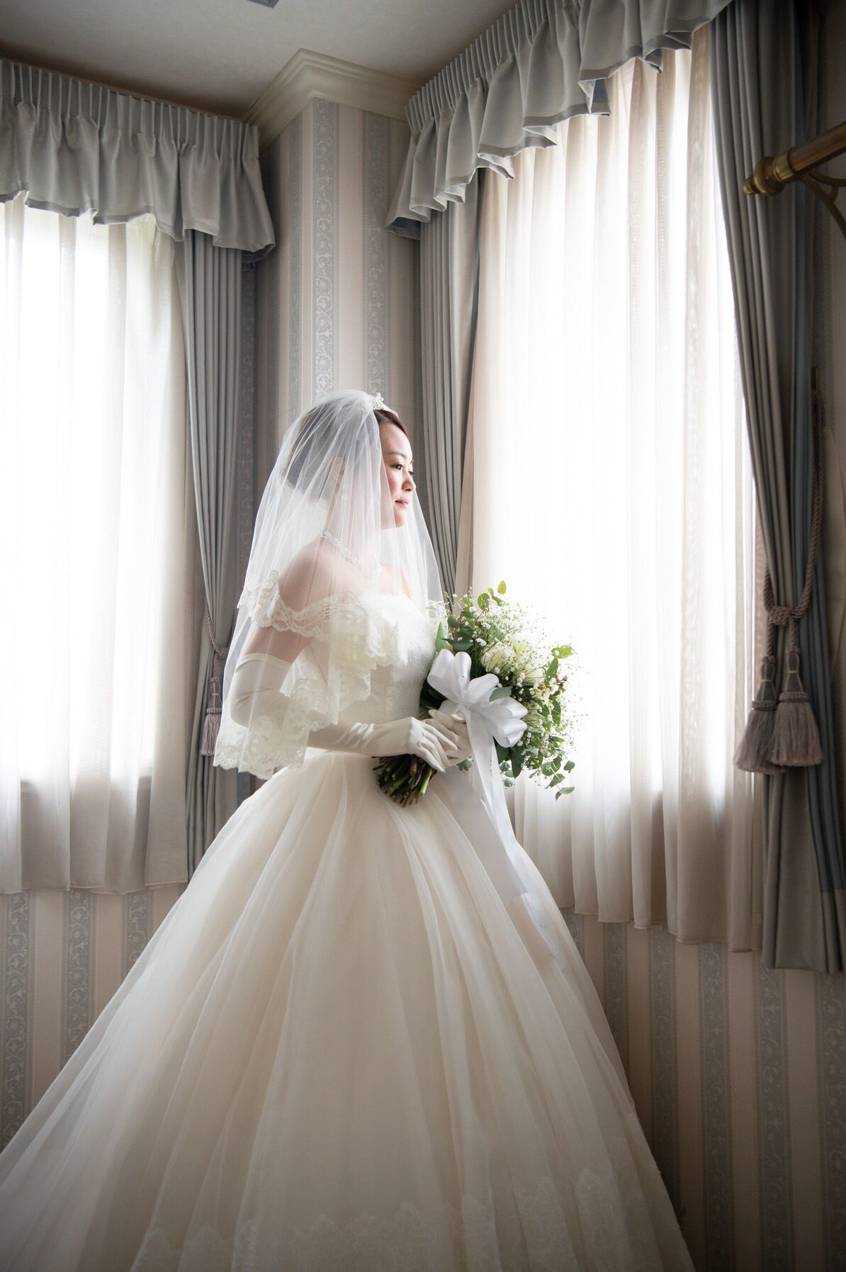 ブーケをボリュームのあるデザインにしたので、ウエディングドレスは裾にレースがあるだけのあまり装飾のないシンプルなプリンセスラインを選びました。