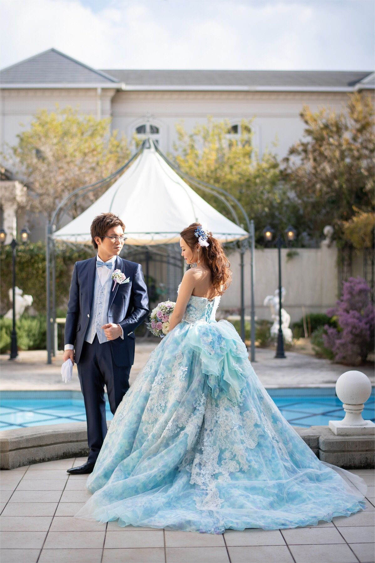 カラードレスでは片側にチュールと生花や装花をミックスさせたヘッドパーツをつけました。