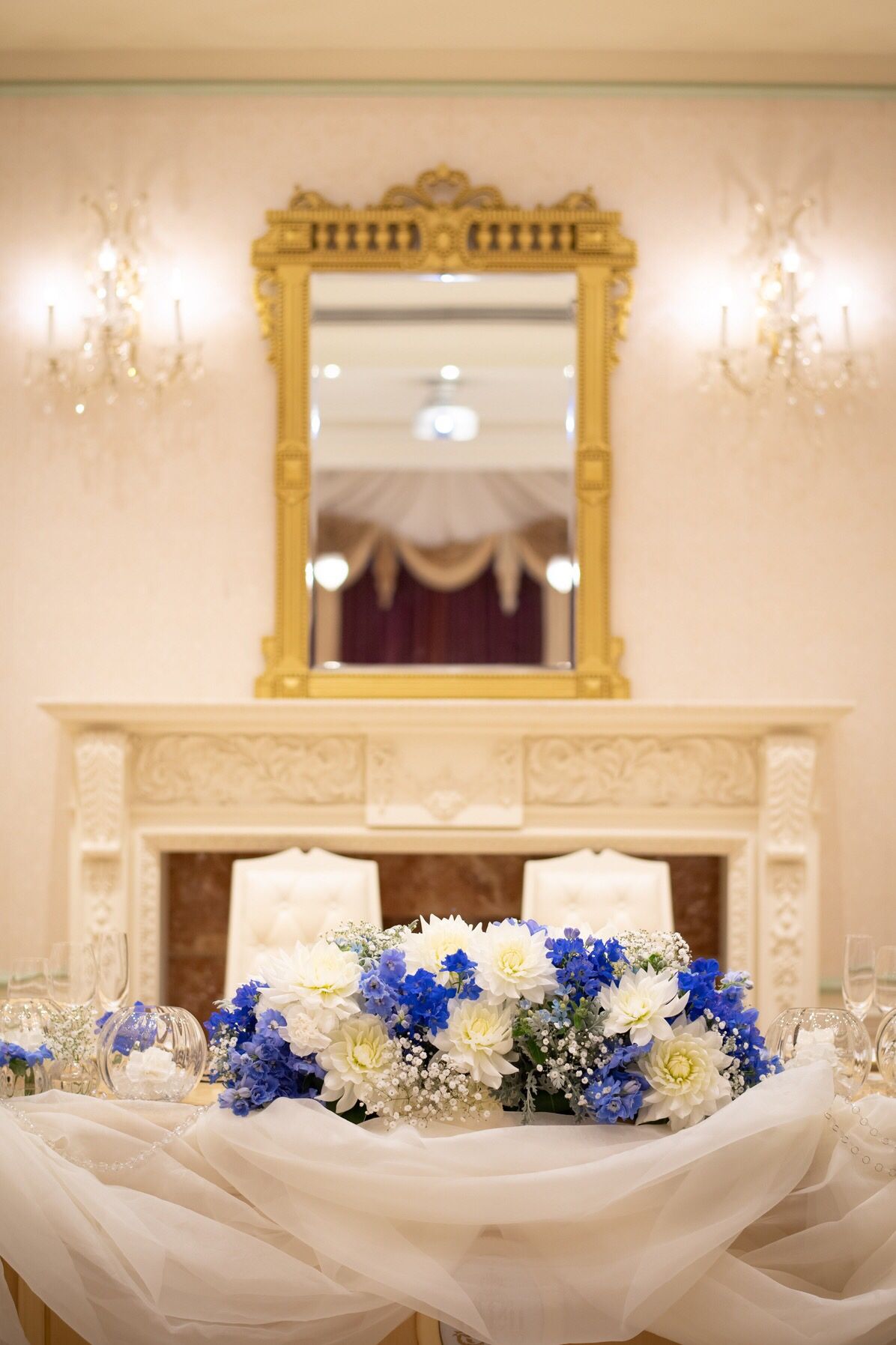 ホワイトとブルーを基調に、予算は抑えながらも寂しくならないよう大きなお花を使ったりしてもらいながら、ボリュームを出してもらいました。
