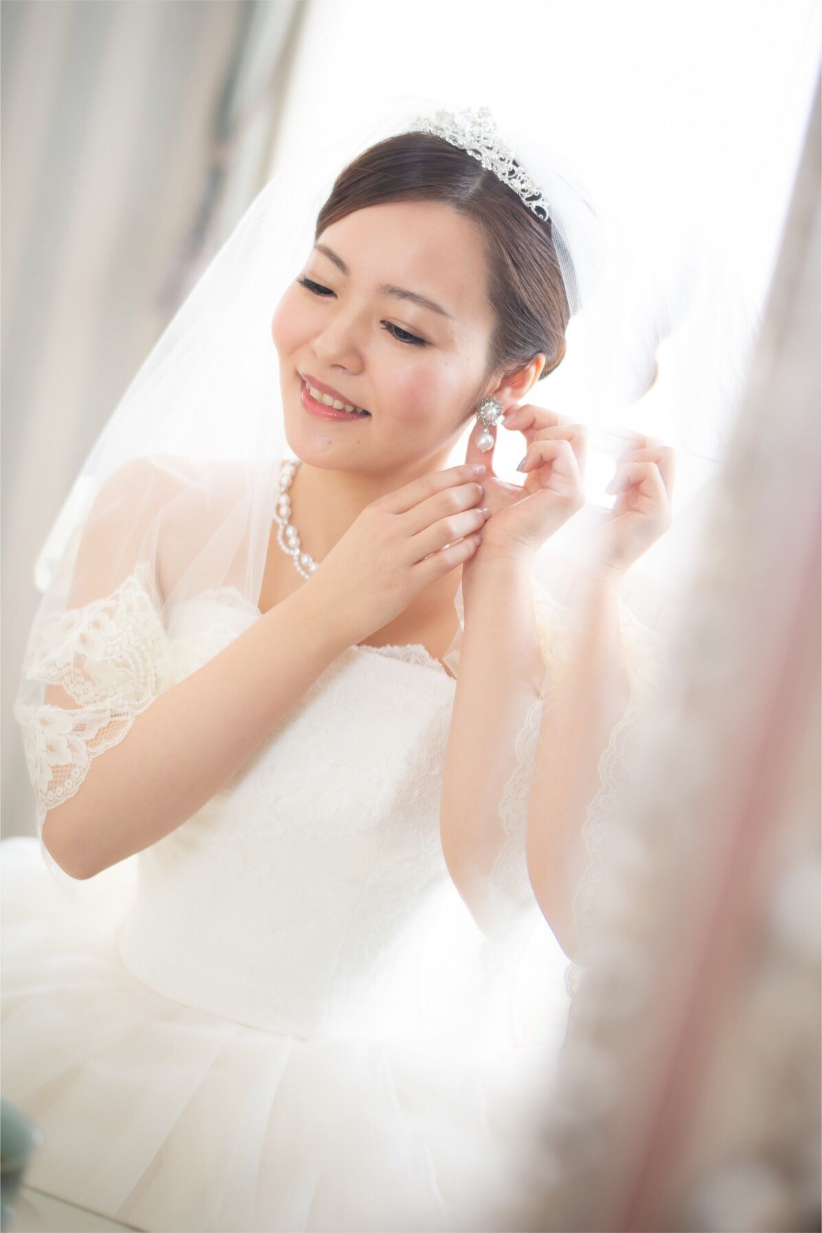 ウエディングドレスにはアクセサリーに合わせてティアラもパールが入っているものを選びました。