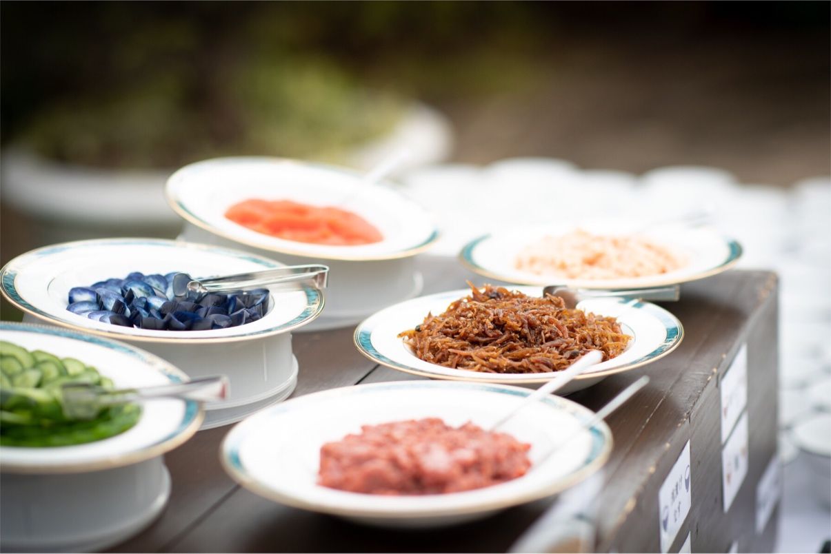 デザートはナシにしてデザートビュッフェを付け、男性ゲスト向けにお茶漬けビュッフェも付けました。