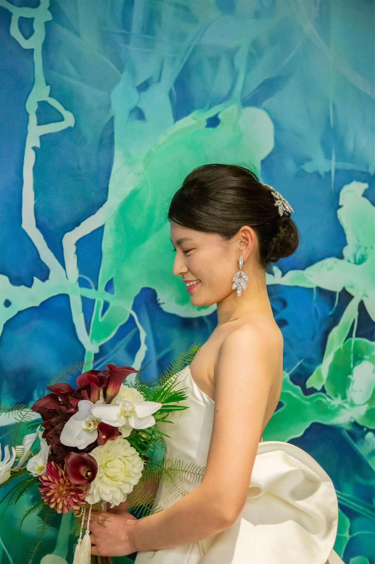 白ドレスはセンター分けの低めシニヨンで、ドレスに合わせた大人な雰囲気にしました。