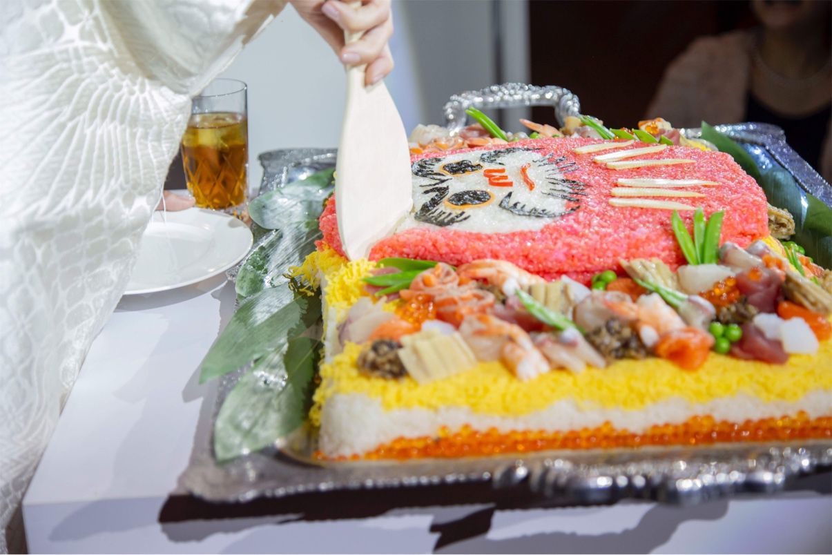ウェディングケーキではなく、だるま柄のちらし寿司に。