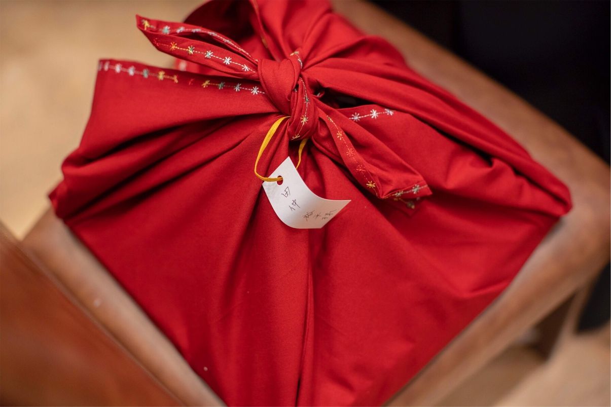 引き出物袋も和を徹底するために、手作りで風呂敷を用意しました。