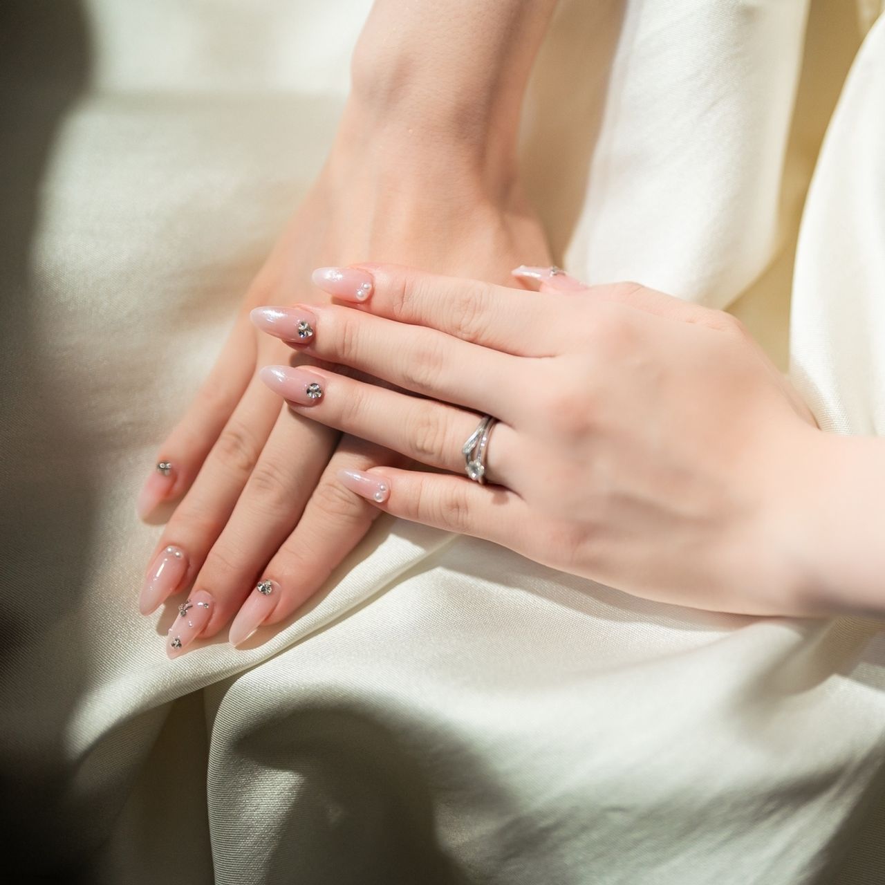 ピンクと白のグラデーションにストーンのパーツをつけて華やかさをだしました。