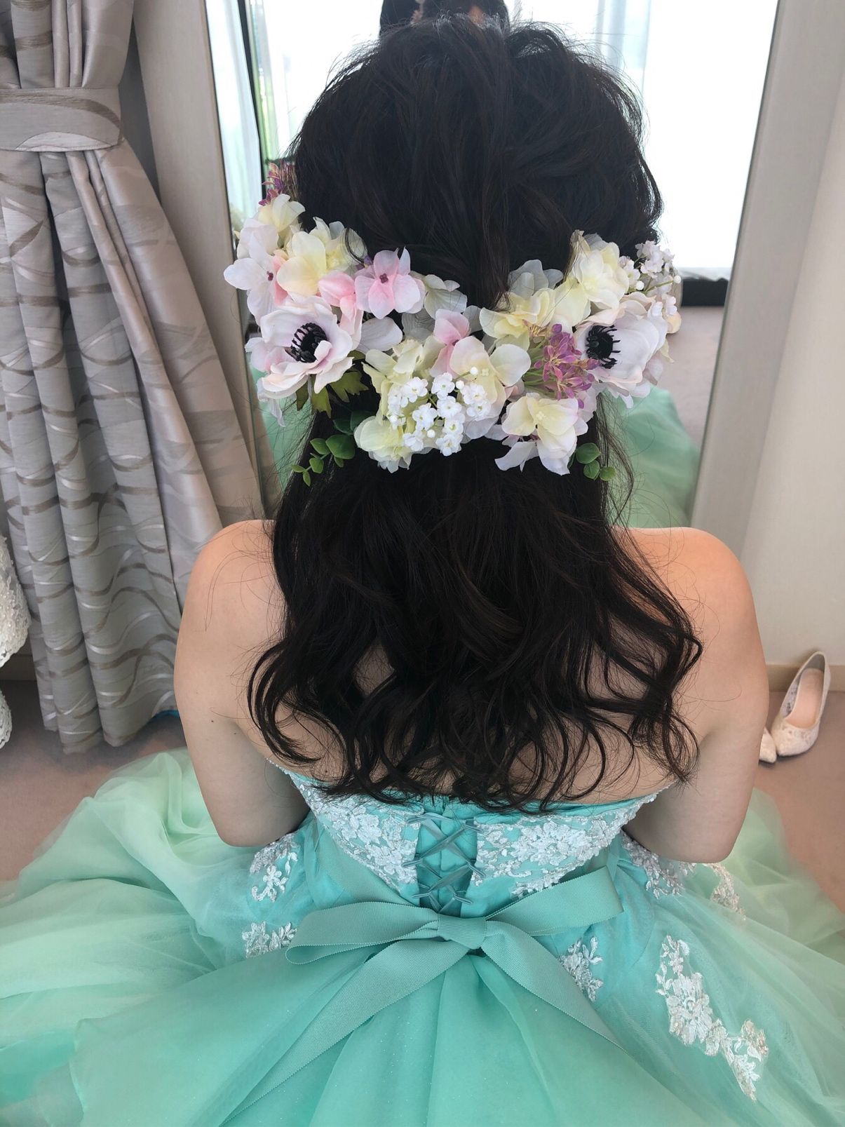 カラードレスはアーティフィシャルフラワーを使って手作りしたヘアーパーツを付けました。