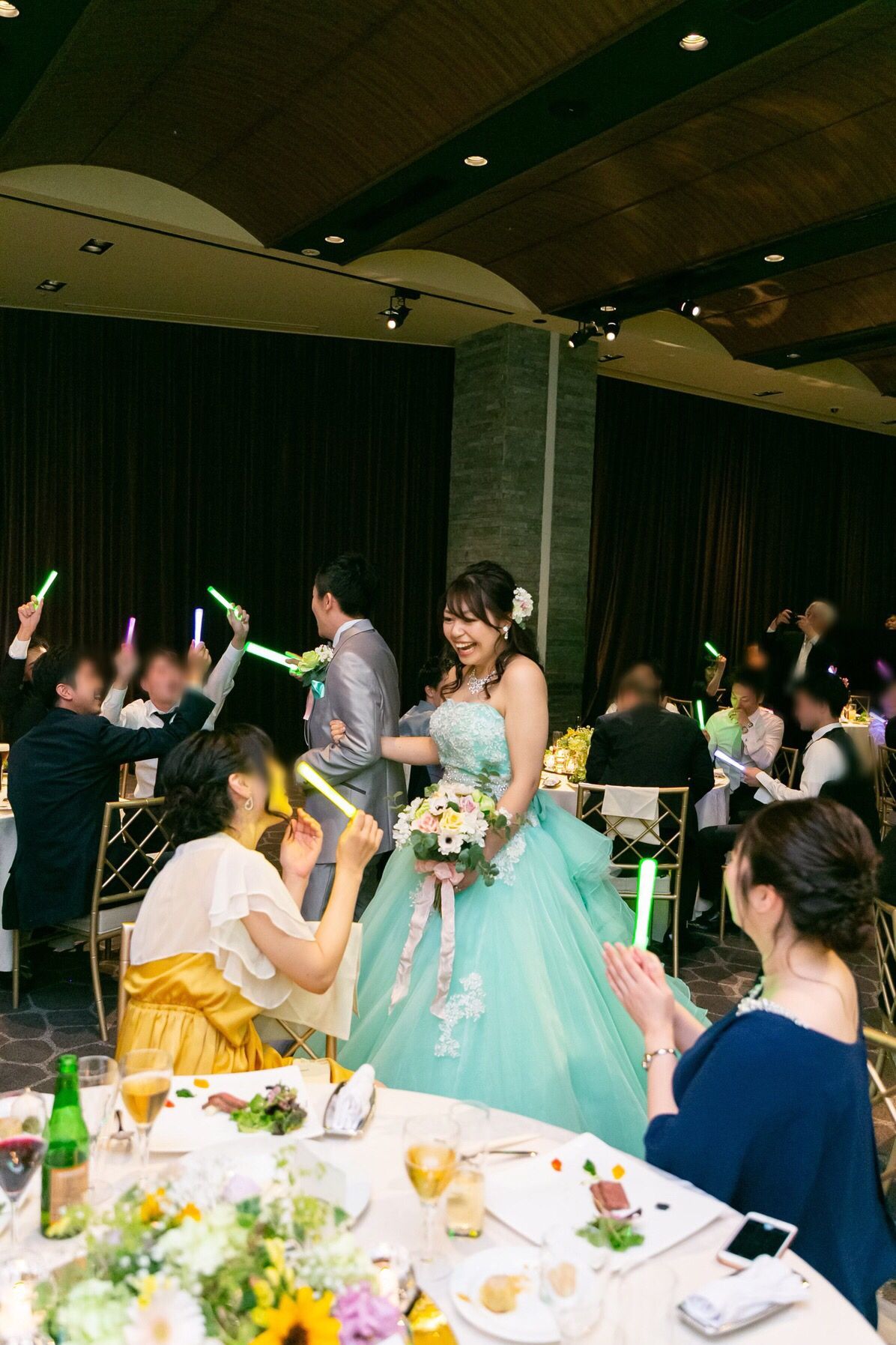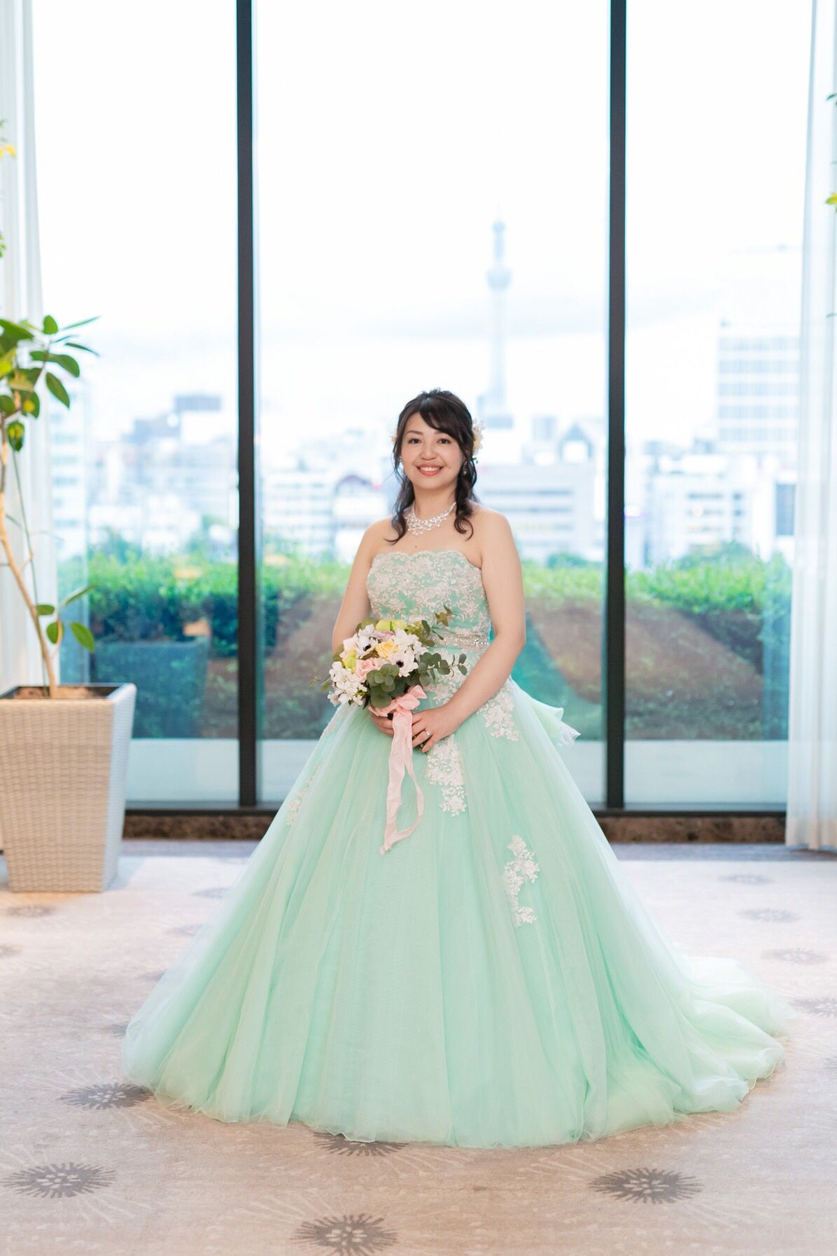 カラードレスはピンクのイメージが強いのでイメージと違う色を着たいと思い、今までの友人の結婚式で着ているのを見たことなく、色がきれいなエメラルドグリーンのドレスにしました。