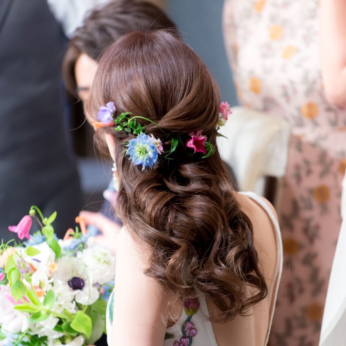 お色直しではブーケと同じ生花を使用していただき、ドレスの刺繍やブーケ、髪飾りと一体感が出るようにしました!