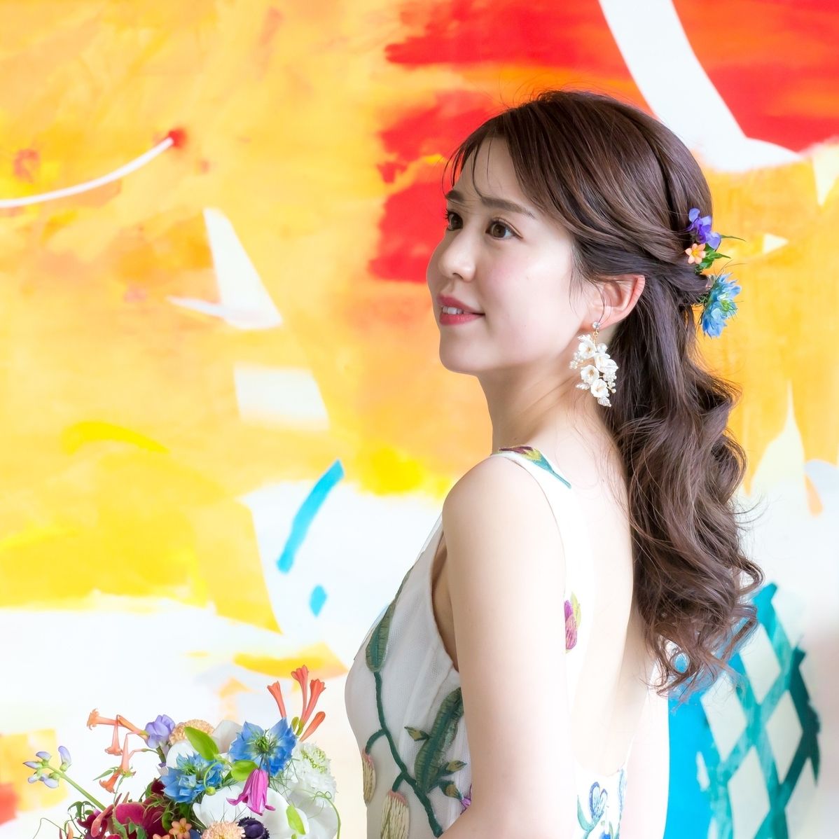 お色直しではドレスの花柄と合わせるため、白いお花のイヤリングにしました。