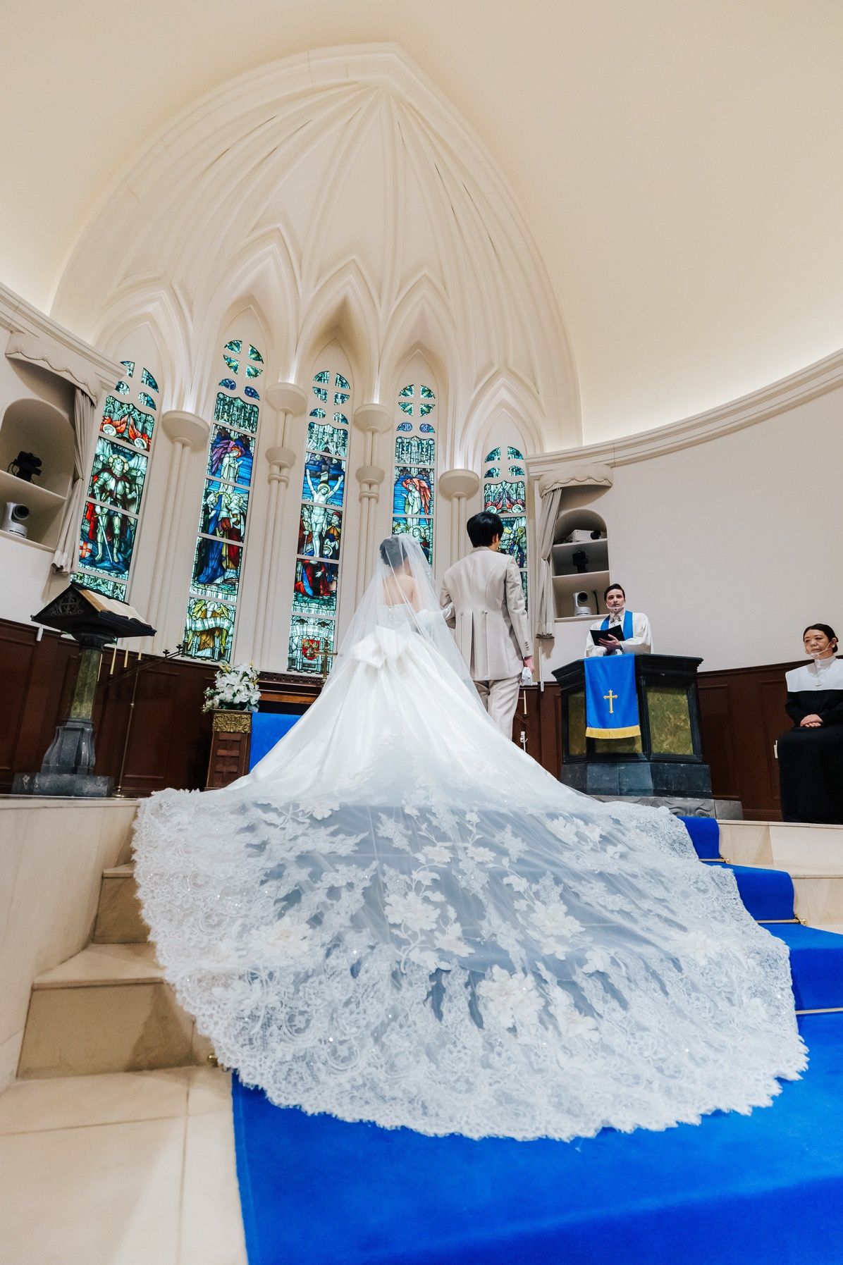 アニヴェルセルといえば青のバージンロードです!ウェディングドレスの美しさを、より一層引き立ててくれます♡また祭壇も高さがあるので、1番後ろに座るゲストからも、新郎新婦2人の姿がしっかり見られることも、おすすめポイントでした🌟