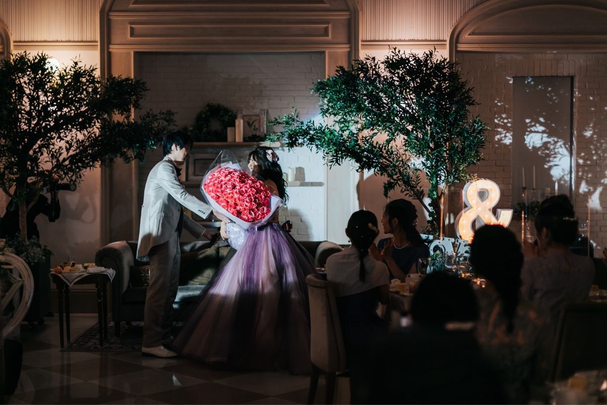 旦那がサプライズで、108本の薔薇をプレゼントしてくれたことです。アニヴェルセルで式を挙げた方のレポや、友人の式でこういうサプライズがあることも聞いていましたが、まさか旦那がしてくれるとは思わず、とても驚きました!