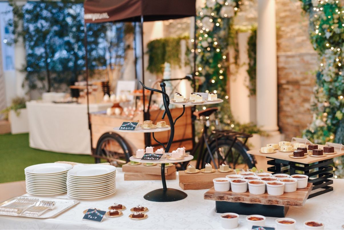 ・全天候型のガーデンも、披露宴会場横についております🌷実際結婚式当日は、雨に雷にと生憎の天気だったのですが、ウェルカムパーティーやデザートビュッフェなども、問題なくガーデンで行うことができました🧁コロナ禍での結婚式でもあったので、ガーデンをオープンしておくことで、換気もできたことが思わぬメリットとなりました!