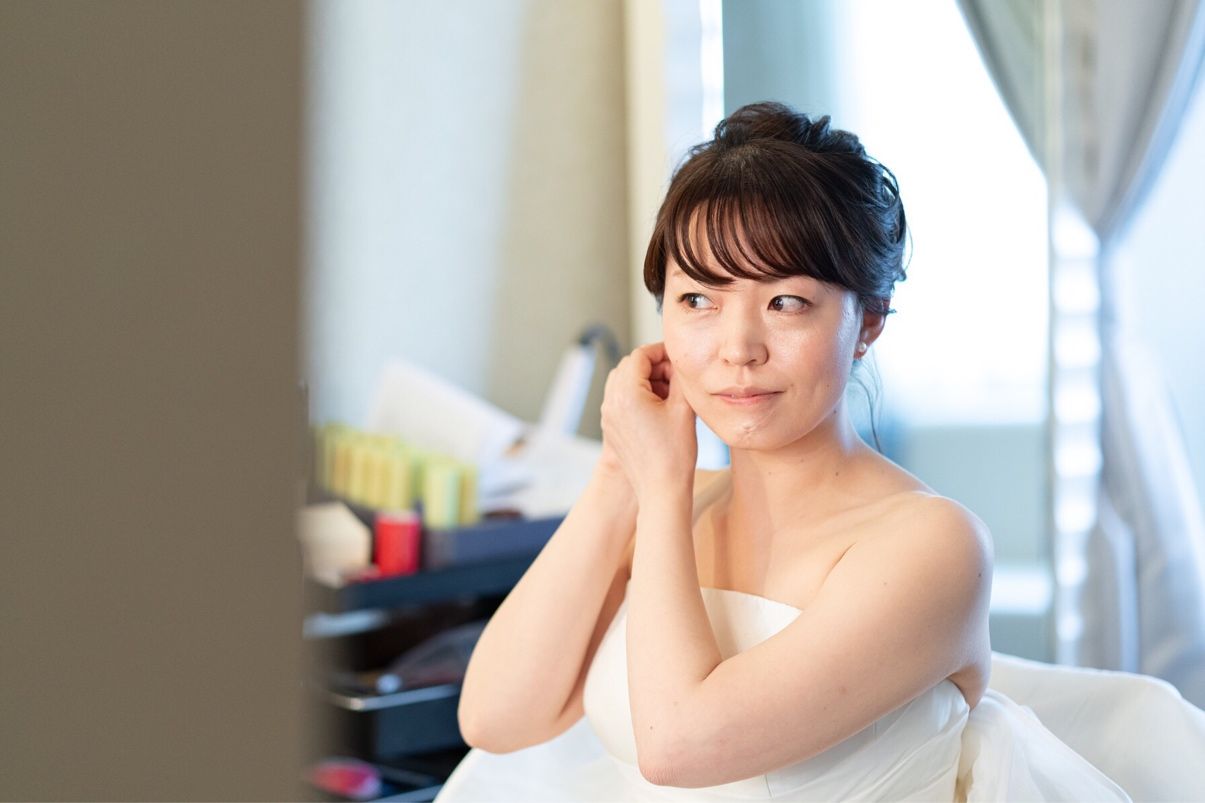 アクセサリーは全てシンプルにしました。ドレスだけで存在感あるのでイヤリングは一粒パール、ネックレスは無しと敢えてシンプルに。