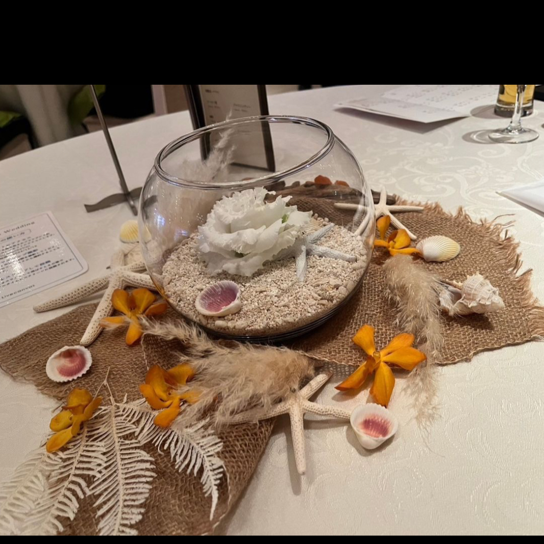 披露宴では、テーブル装花に砂やヒトデ、麻布を使用し、メインテーブルには流木を取り入れることで、ビーチらしさを演出し、自分たちが思い描いていた“リゾートウエディング”を形にすることができました。
