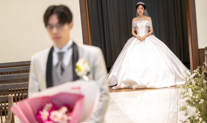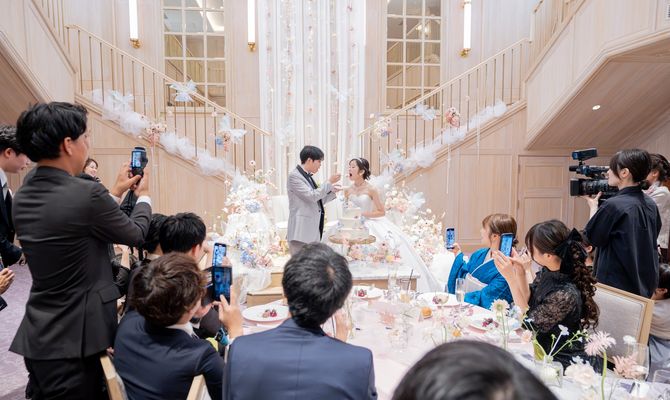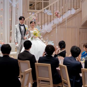 また、この会場を選んだ理由は、装花のクオリティがとても高かったことに加え、披露宴会場の高い天井や丸みのあるシャンデリア、正面に伸びる階段などのデザインを一目見て感動したからです。