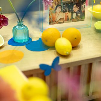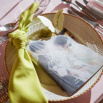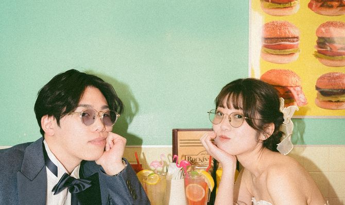 普段の私はビビッドカラーやポップなデザインが好きなこともあり、前撮りは街中でポップなテイストに撮影してもらったのですが、中でもダイナー風のカフェで撮影した写真が気に入り、その写真をウェルカムスペースのタペストリーに採用しています。その一枚に雰囲気を合わせたことで、カラフルでポップな空間に仕上がり大満足です。