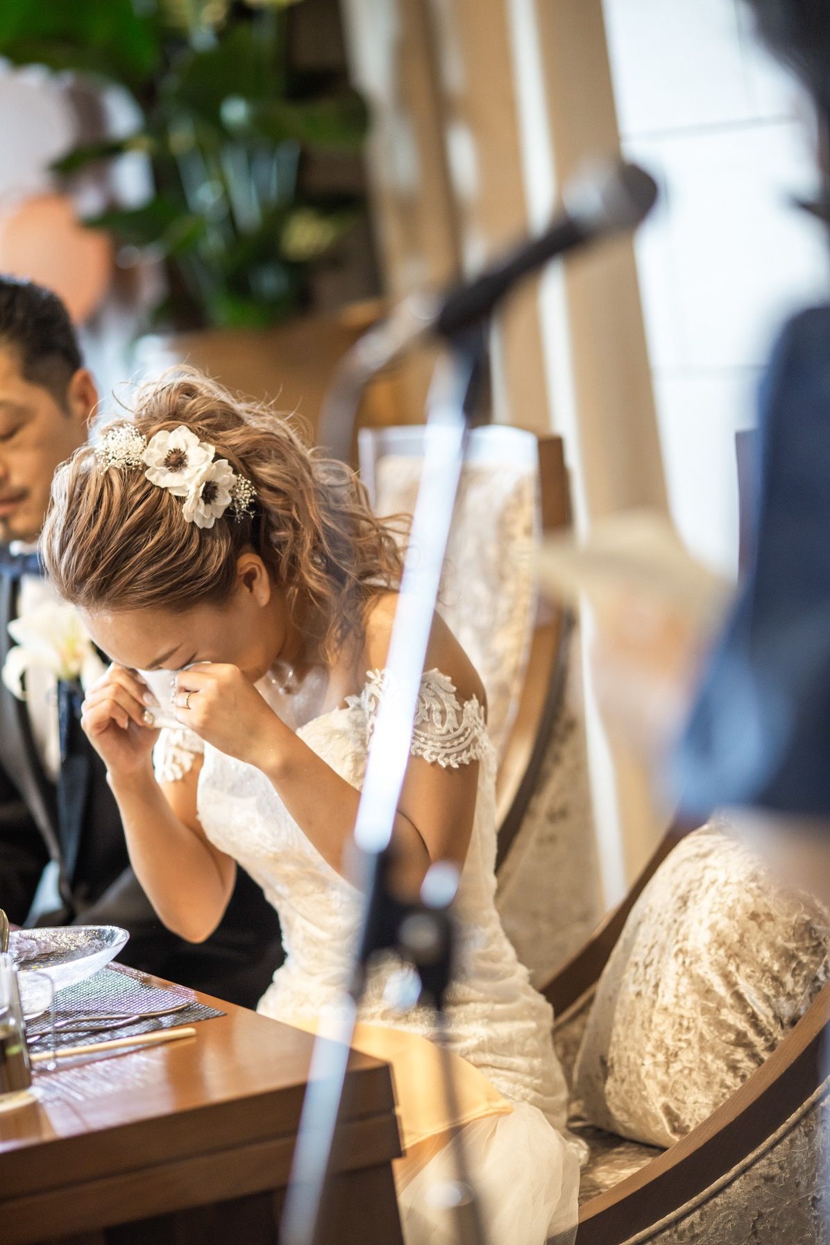 友人代表スピーチです。私と家族や主人のことを交えたお手紙だったので、とても感動しました。友人が前に出てくるときにはもう号泣しており、それをみて私もつられました。お手紙を読んでいるときも、もちろん号泣で顔がなくなってしまいました。笑