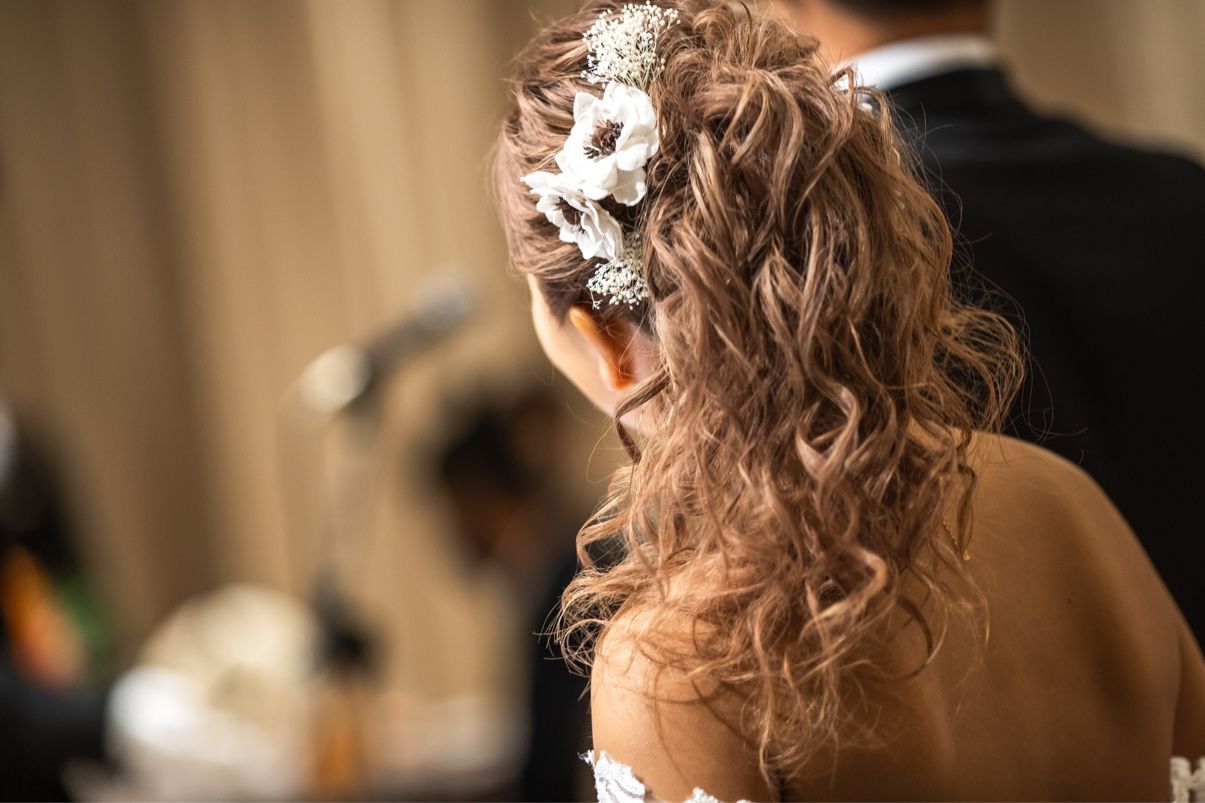 ルーズな感じを出したかったので、全体的にふわふわにしてもらいました。挙式から終わりにかけてギャップを出したかったので、アップからダウンにしました。
