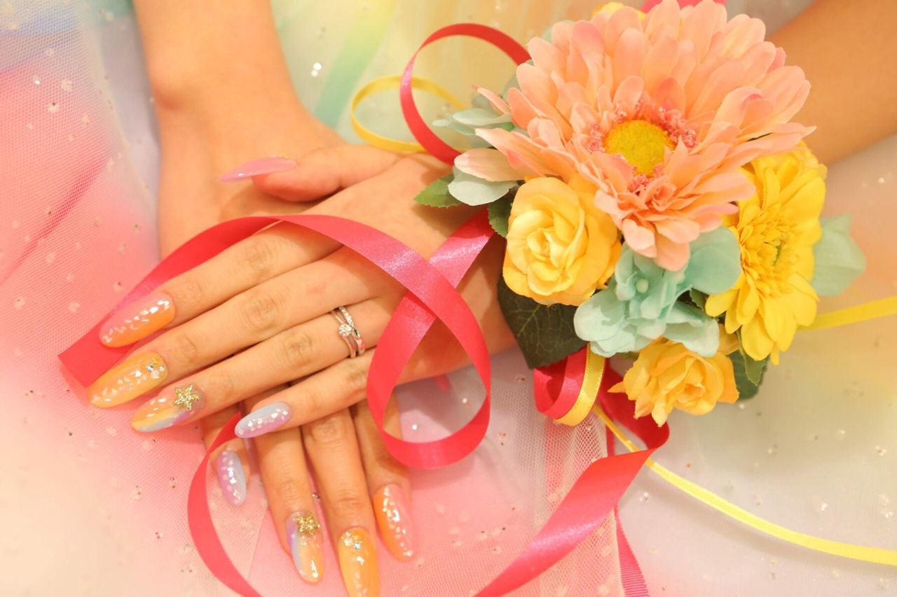 ウエディングドレスでは、白のをベースにリボンとストーンをいれてもらいました。カラードレスでは、カラフルにしてもらい、星をいれてもらいました。