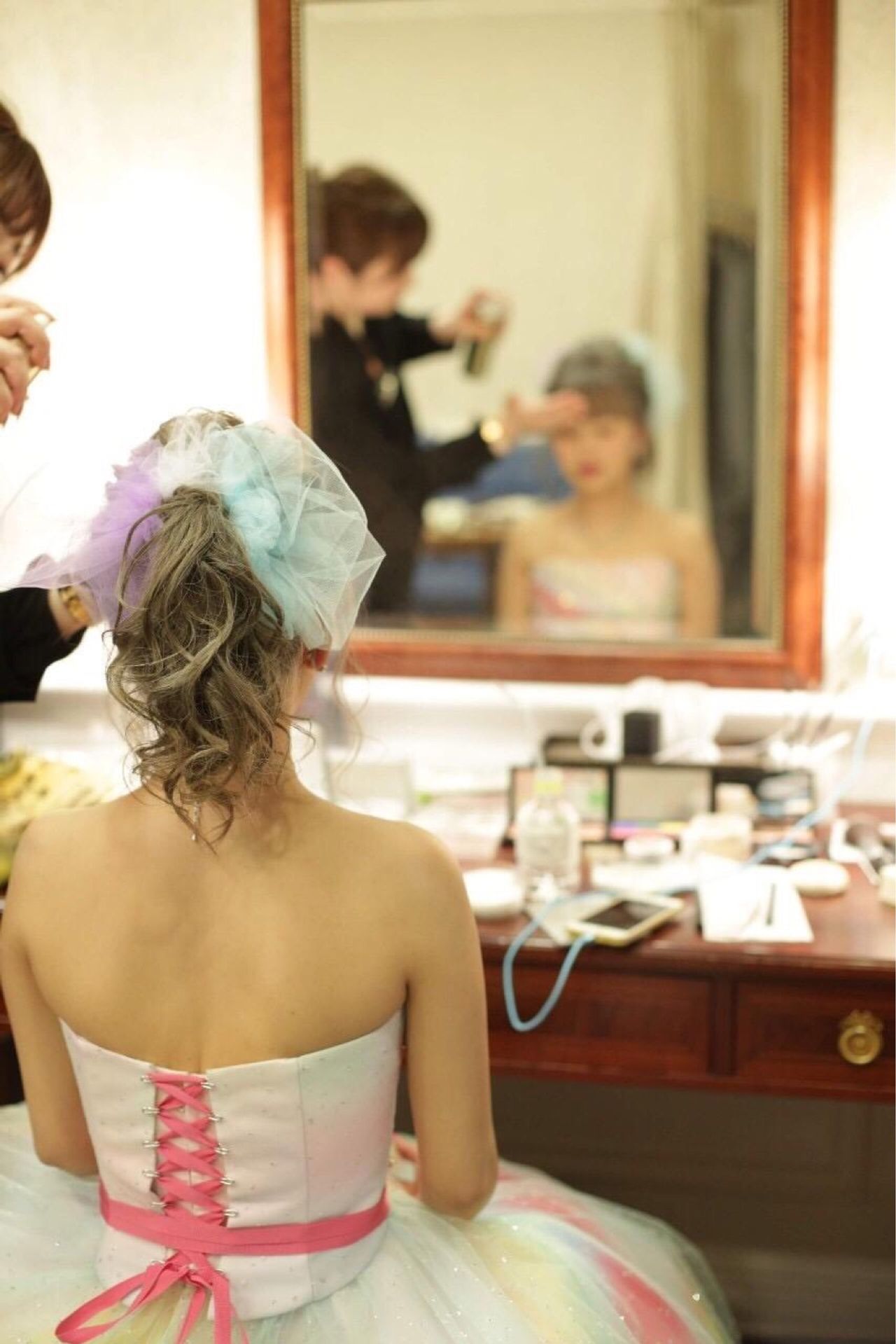 元々レインボーが着たかったので。その中でも虹ドレスは色がしっかりしているので、当日色飛びが無さそうだなと思ったのと、グリッターが散りばめてあってキラキラしてる所と、ポイントの紐ベルトがかわいくて、着た瞬間に決まりました。