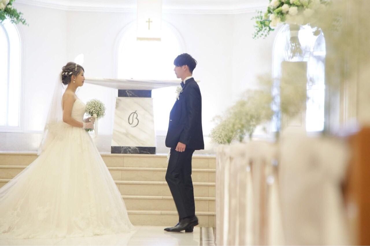 チャペルのバージンロードが長いので、ゆっくりと噛み締めて歩くことができました。全体的に白がメインとなっていて雰囲気も良く、きれいな写真が残せました。