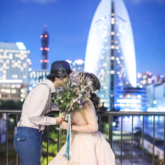 天井が高くガラス張りのため、とても広く感じます。海も見えるロケーションととてもおしゃれで開放的な空間です! ゲストも二階から階段を降りて入場することができるので披露宴会場が一望できます。テラスが開放できるので、昼は綺麗な海が見えて、夕方から夜にかけてはみなとみらいの夜景が一望できます。ゲストと一緒にテラスに出て写真撮影もおすすめです!