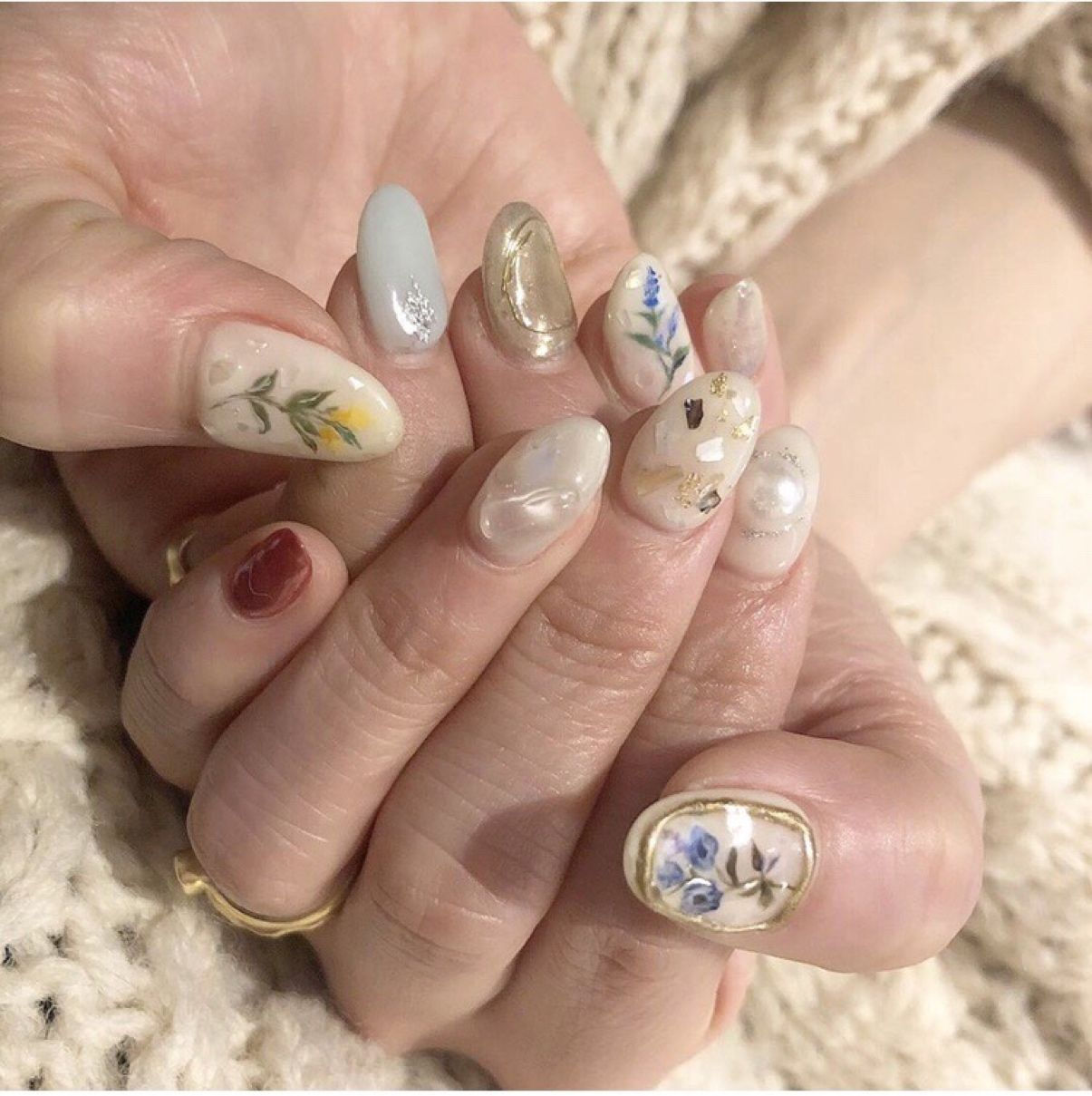 乳白色ベースに、手書きのお花とミラーを効かせた、10本ぜんぶ違うデザインのニュアンスネイル。
