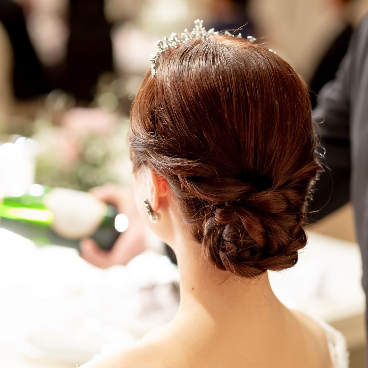 シニヨンは大きすぎず高すぎずの位置にし、ドレスにマッチするよう上品に仕上げていただきました。