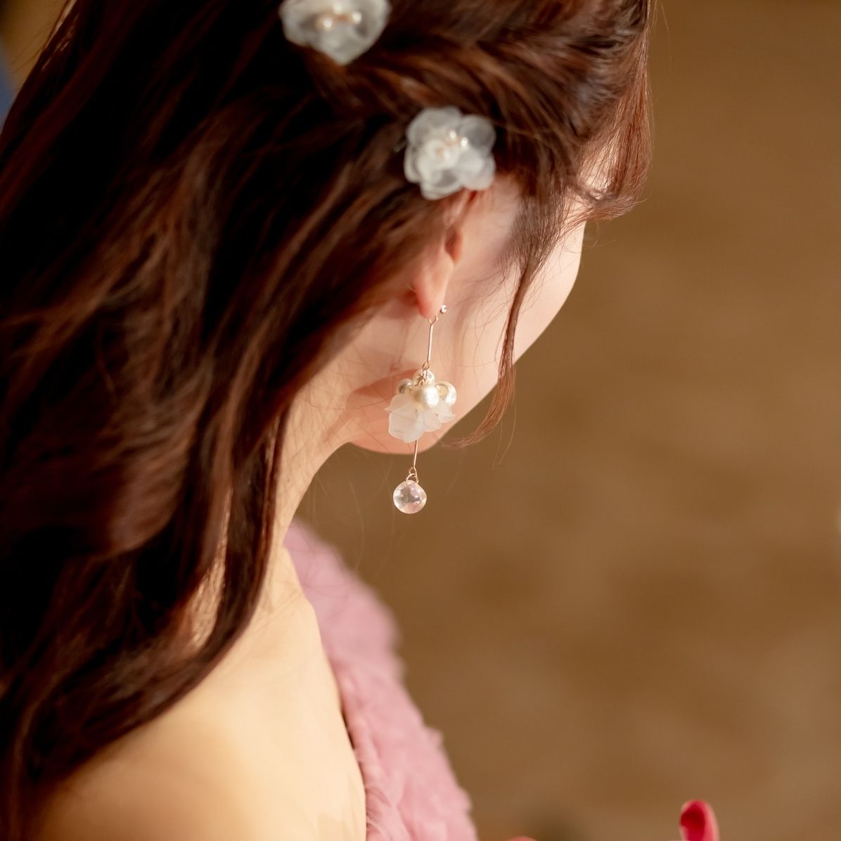 カラードレスのヘアアクセサリーはピアス同様、お花で統一感を出して全体的に散りばめてもらいました。