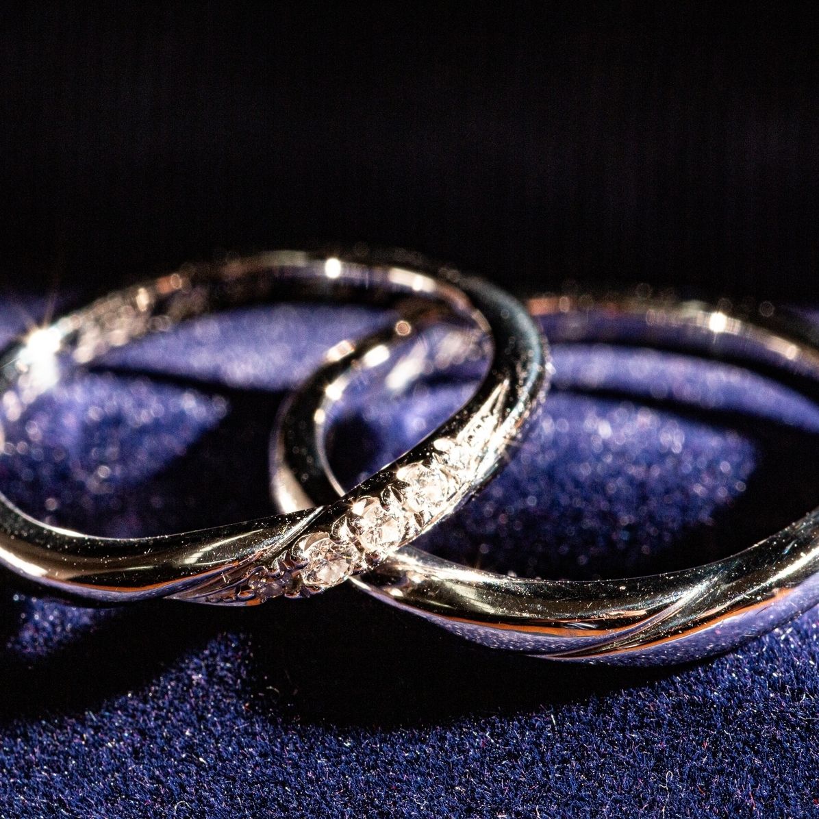 夫の指輪も大袈裟でない斜めのラインが入っており、上品さを感じられます。