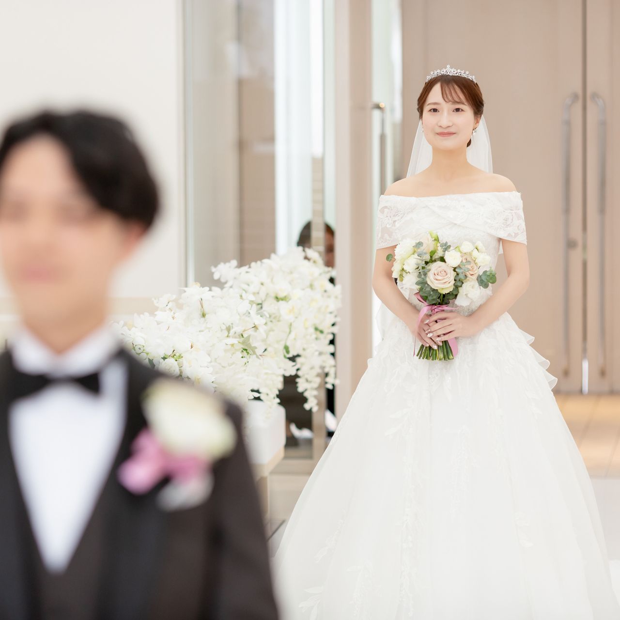 1人で歩くバージンロードはとても緊張しましたが、夫が私のドレス姿を見て笑顔になったのを見て、緊張がほぐれたのをよく覚えています。