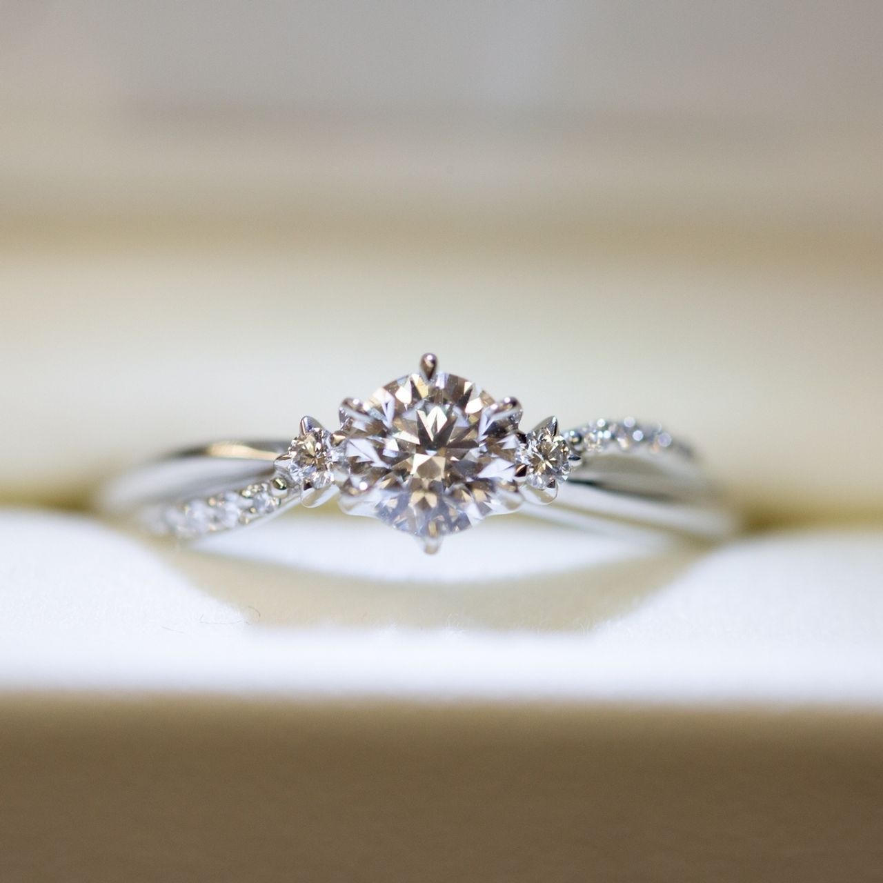 リング自体は真っ直ぐなため結婚指輪とも合わせやすいですが、斜めにメレダイヤが入っていて、指が長く見えるデザインがお気に入りです♡