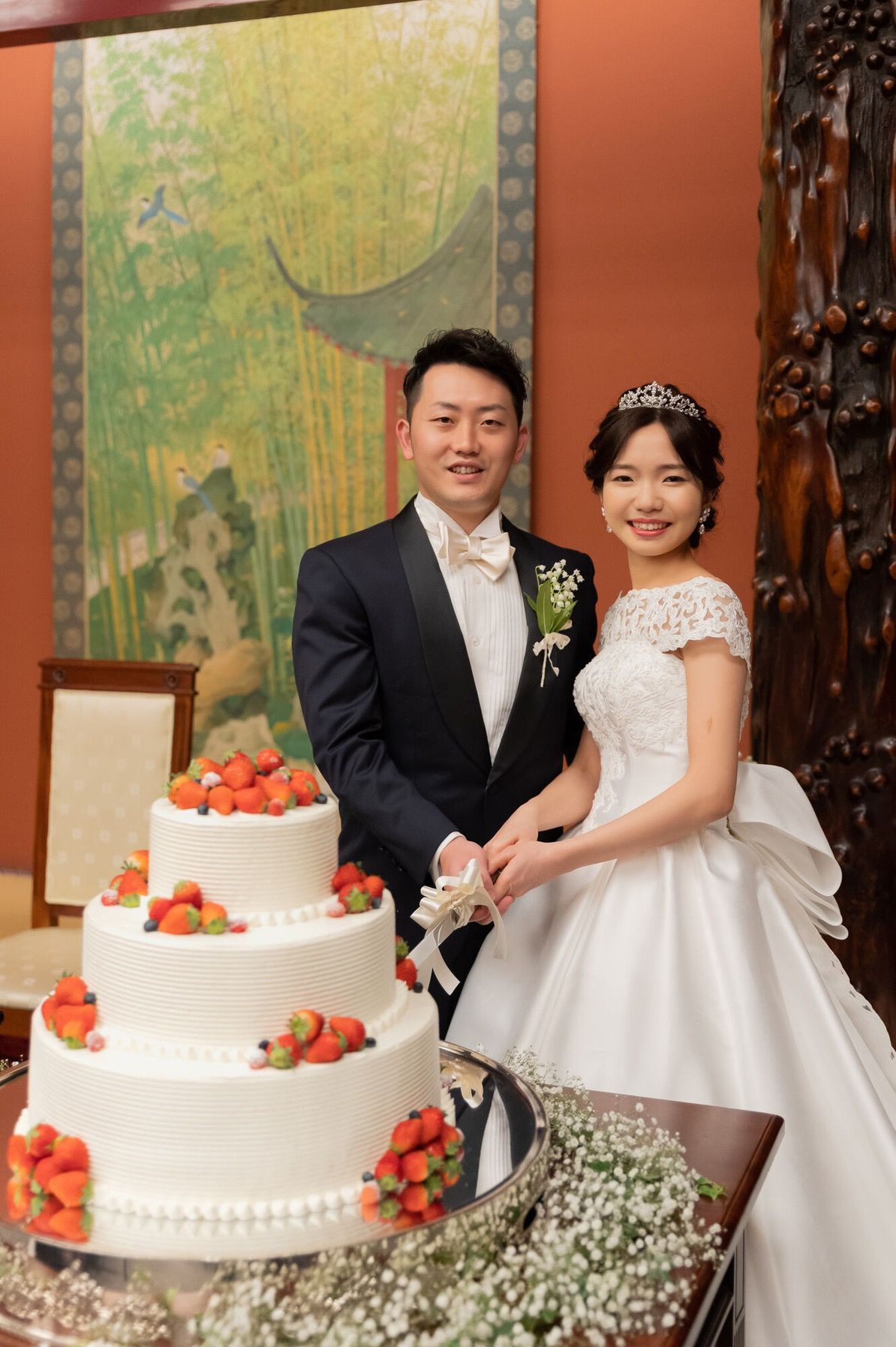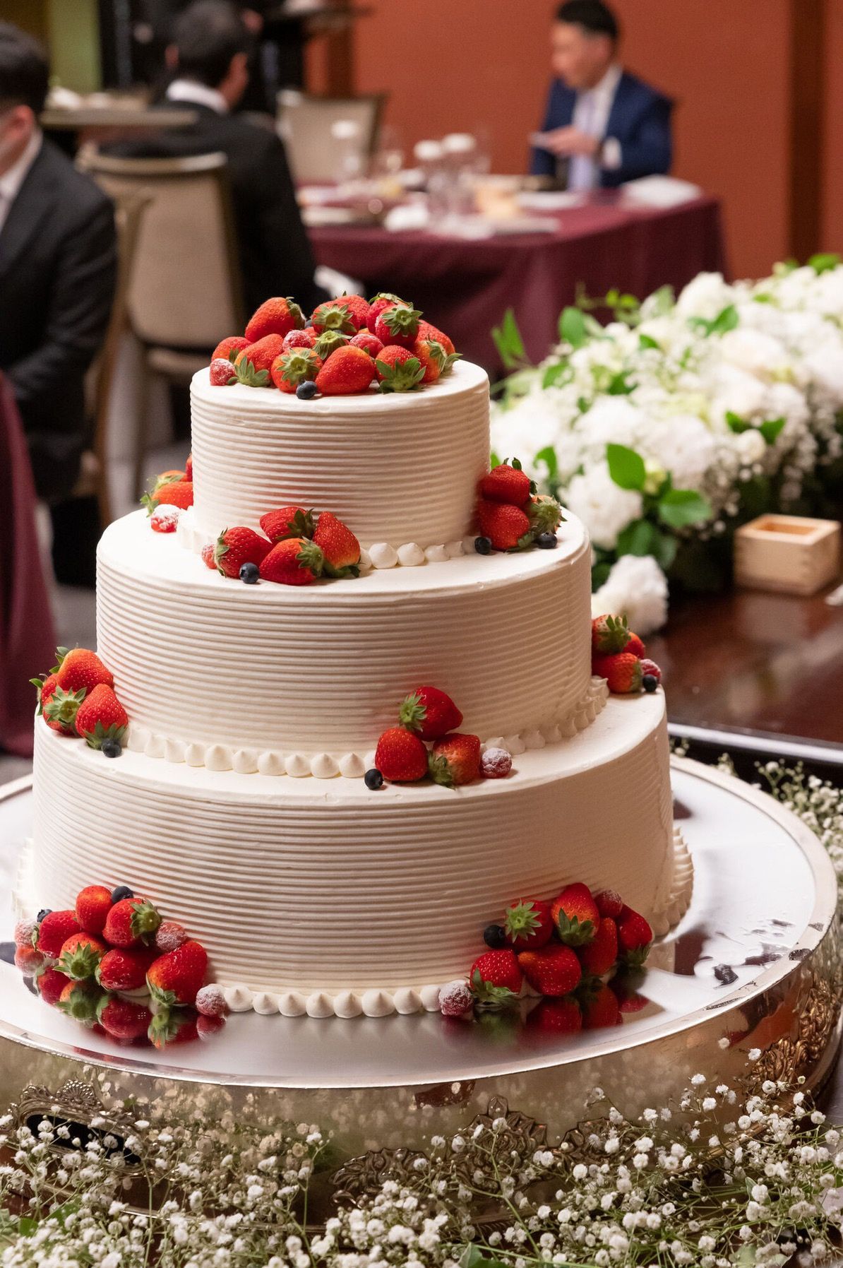 ウェディングケーキは三段の苺のショートケーキにしました。