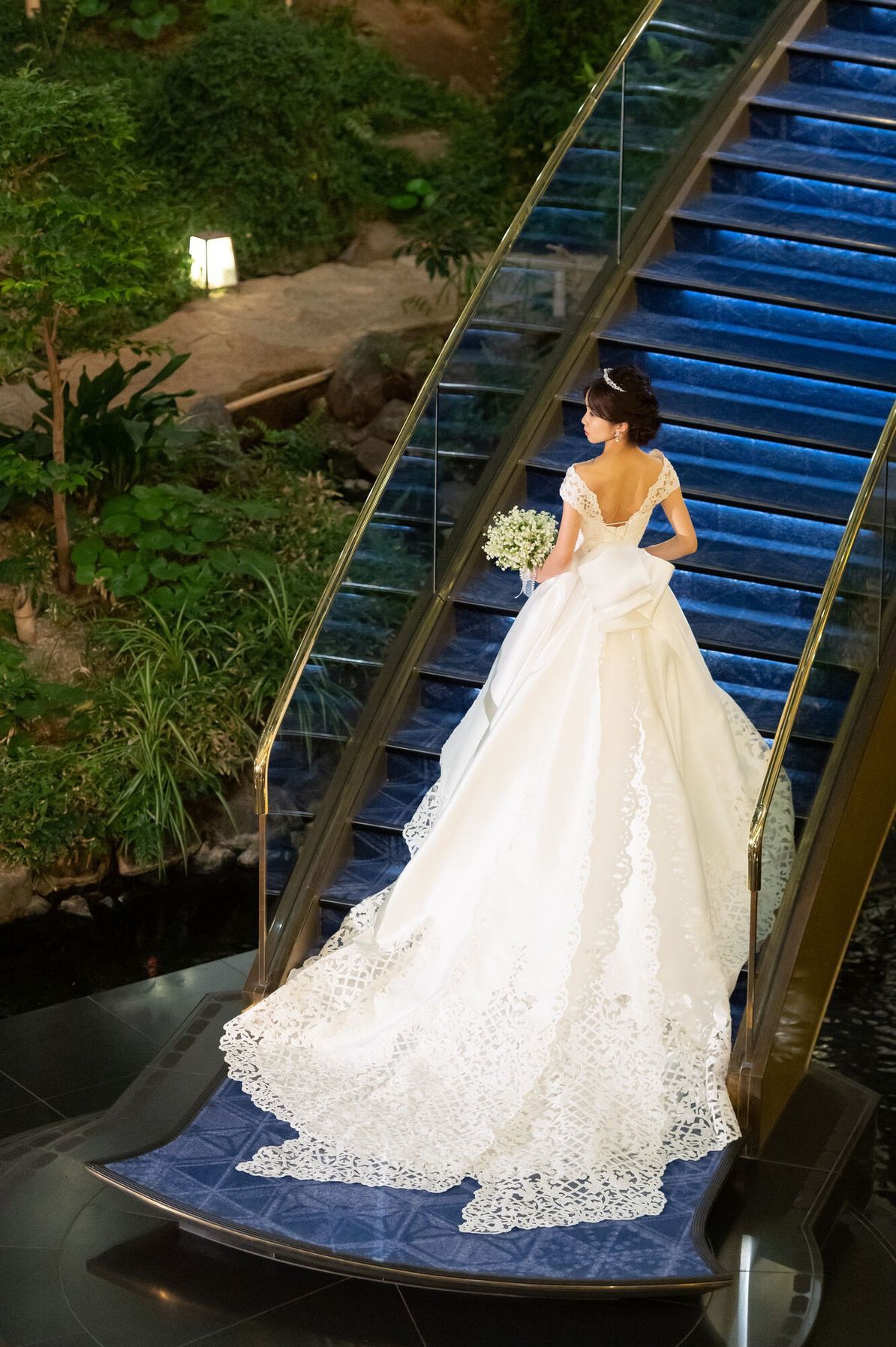 三着目にはホテル雅叙園東京オリジナルのウェディングドレスを選びました。シンプルな形やデザイン、細やかなレースが素敵なところに惹かれました。