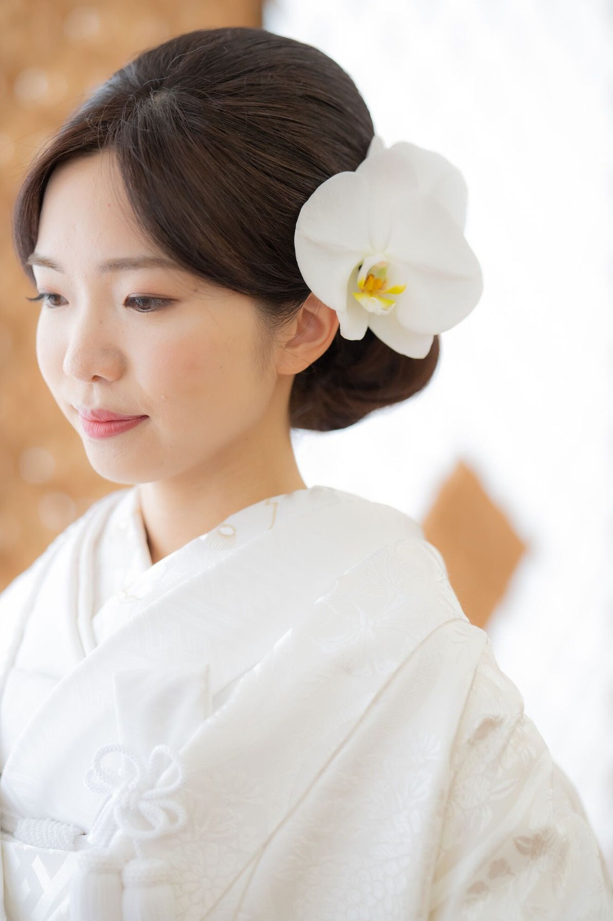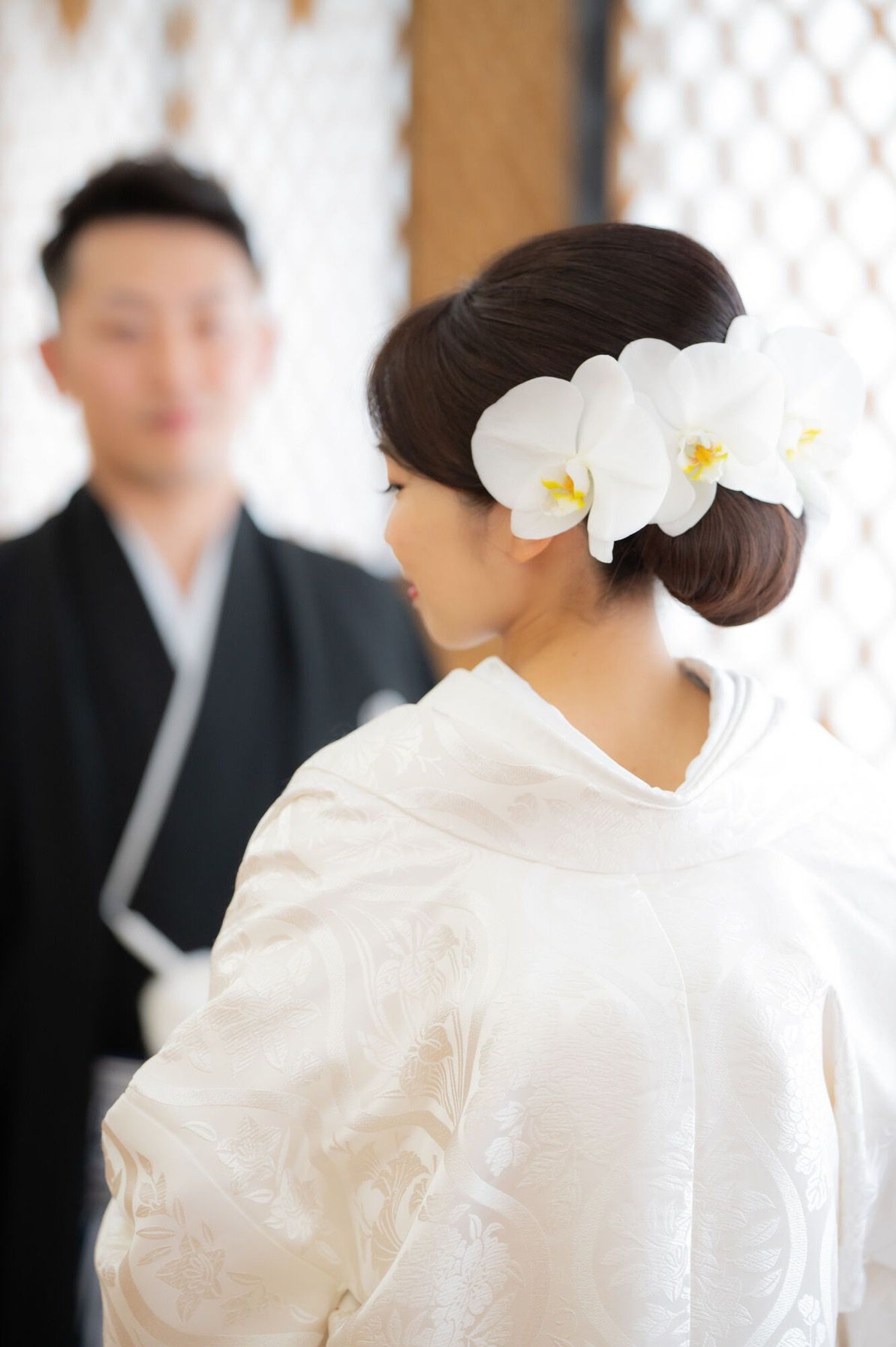 和装には生の胡蝶蘭、ウェディングドレスにはティアラを合わせました。