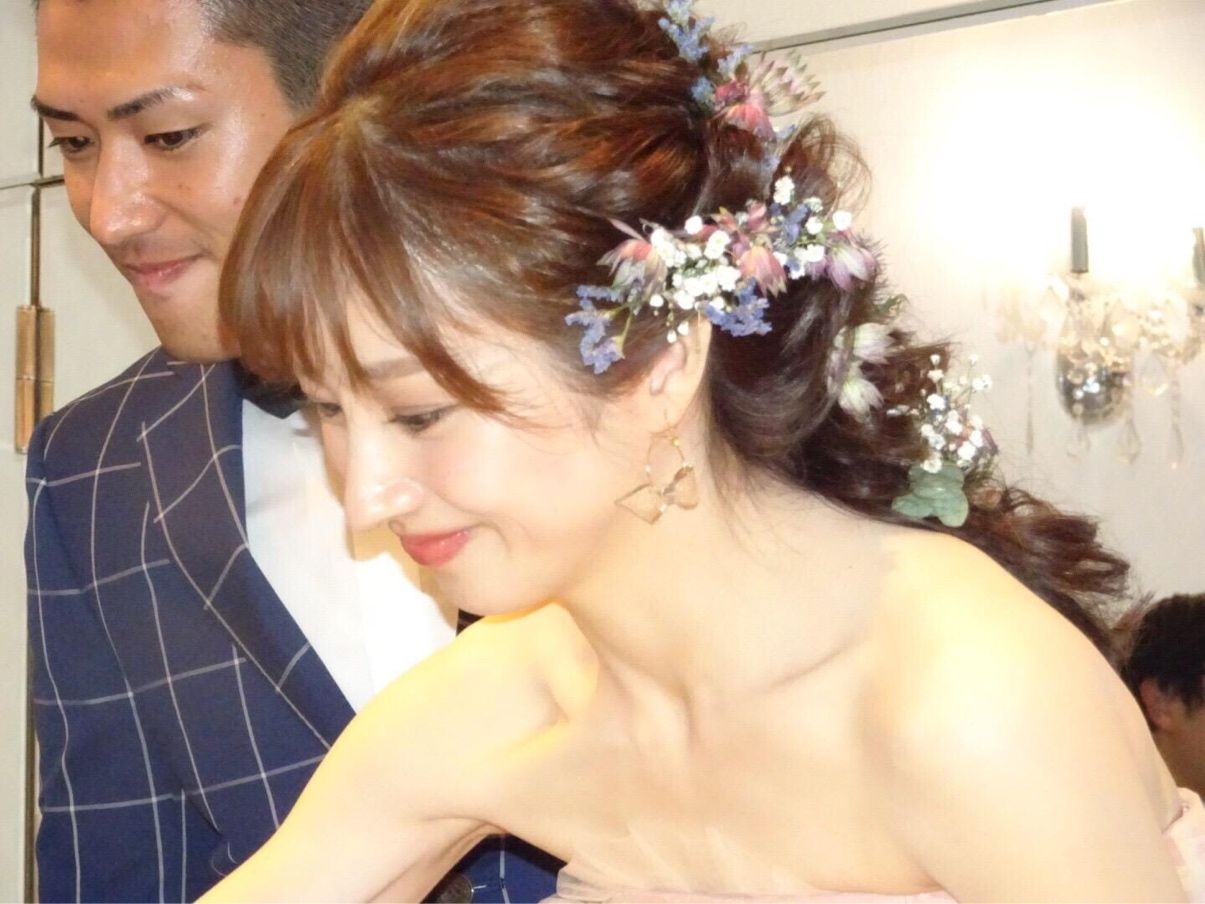 カラードレスの際はハーフアップの編み込みスタイルにブーケと同じ花を差し込んで頂きました。