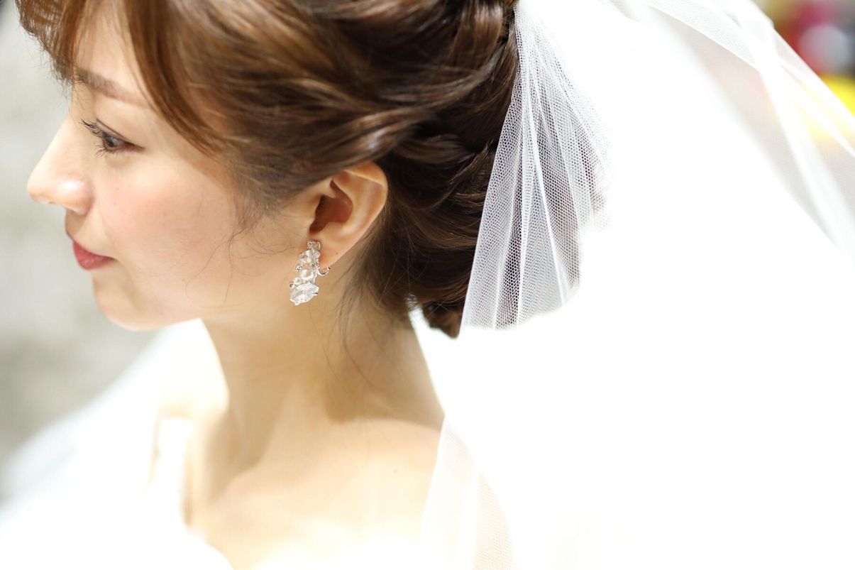 ヘアデザインは、ウェディングドレスの際はティアラを付けるので編み込みのアップに。