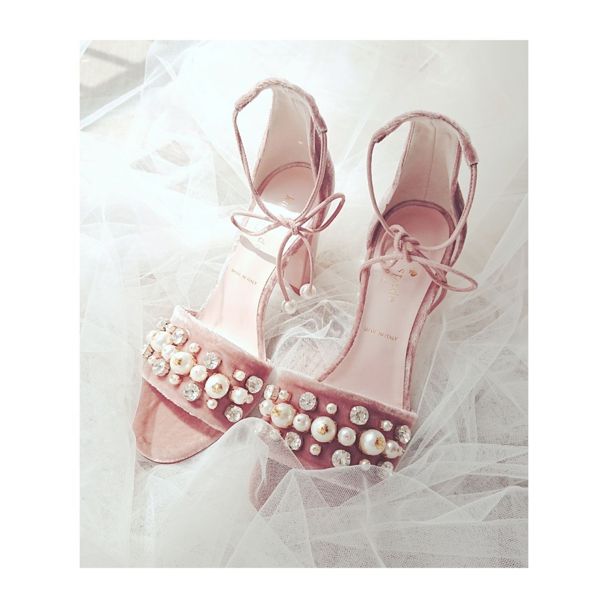 挙式は甘いスタイルだったため、katespadeのピンクのベロアのビジューサンダルにしました。