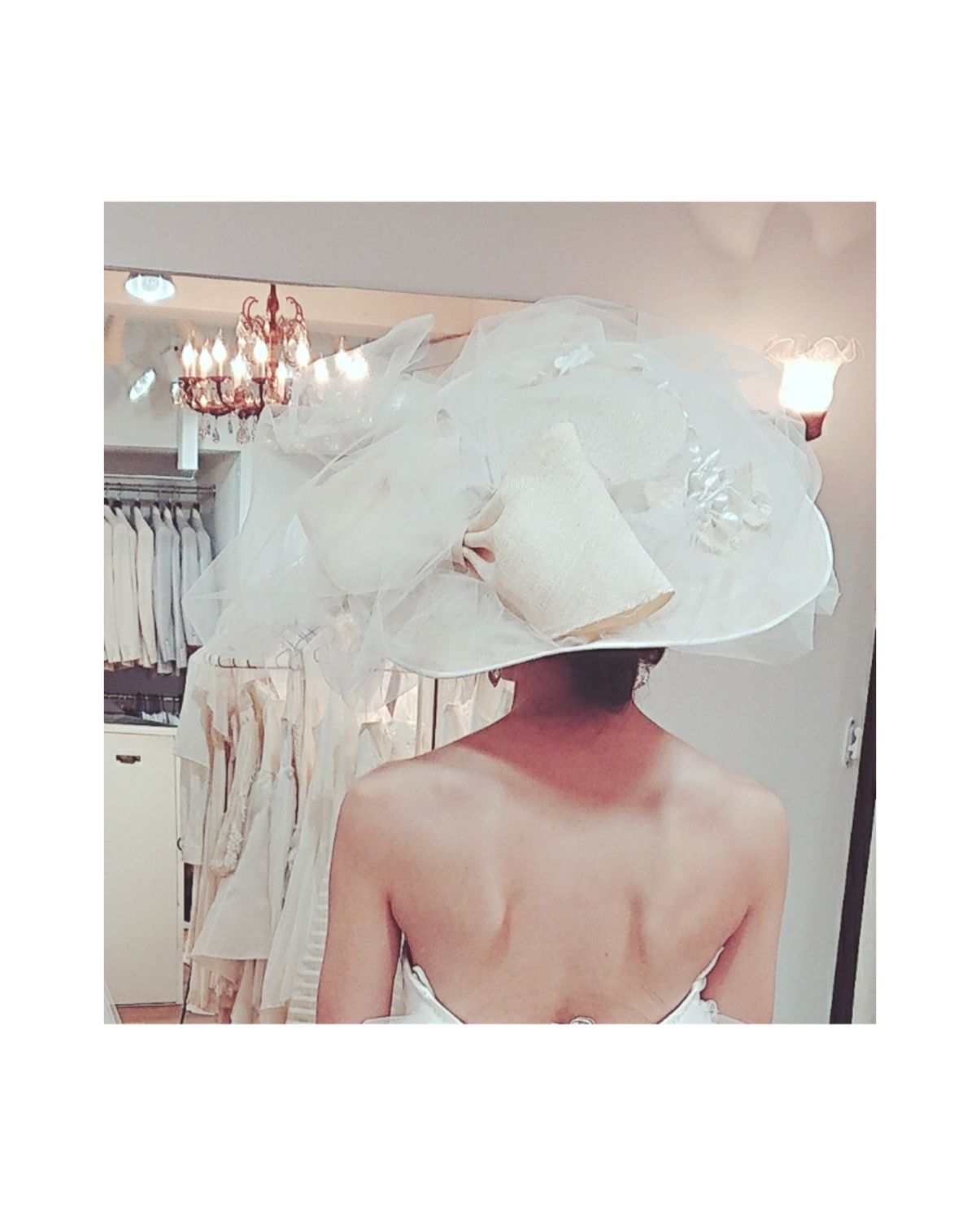 挙式はca4laのヘッドドレスをつけ、パーティーではcliomariageでレンタルした大きなハットにしました。