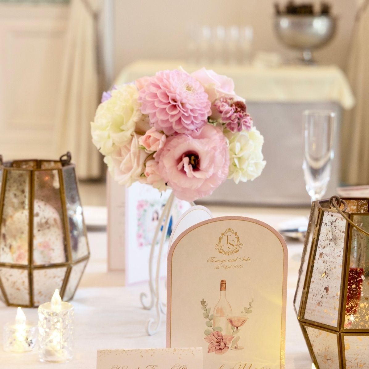 ピンク × ホワイト × パープルを基調にとても可愛らしい雰囲気の装花に仕上げていただきました💐