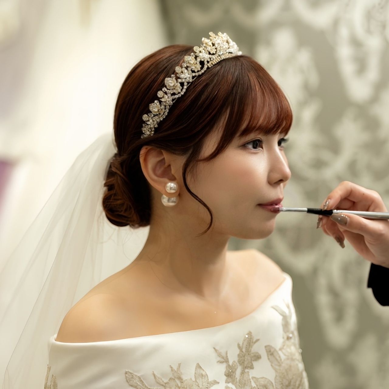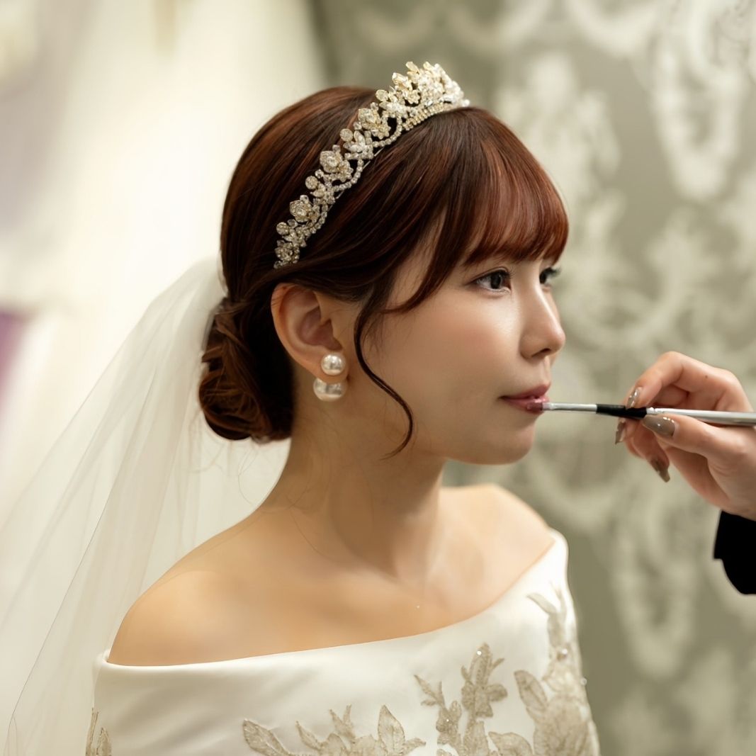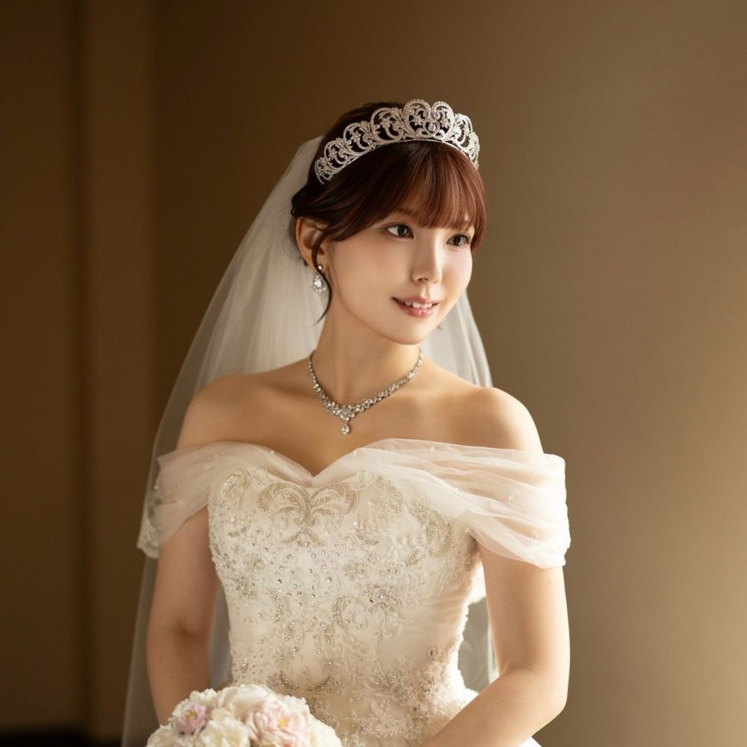 ⧉ ロールカラーケープのドレスに合わせてネックレスをあえて着用せず、ティアラとパールピアスで上品にまとめました🫧