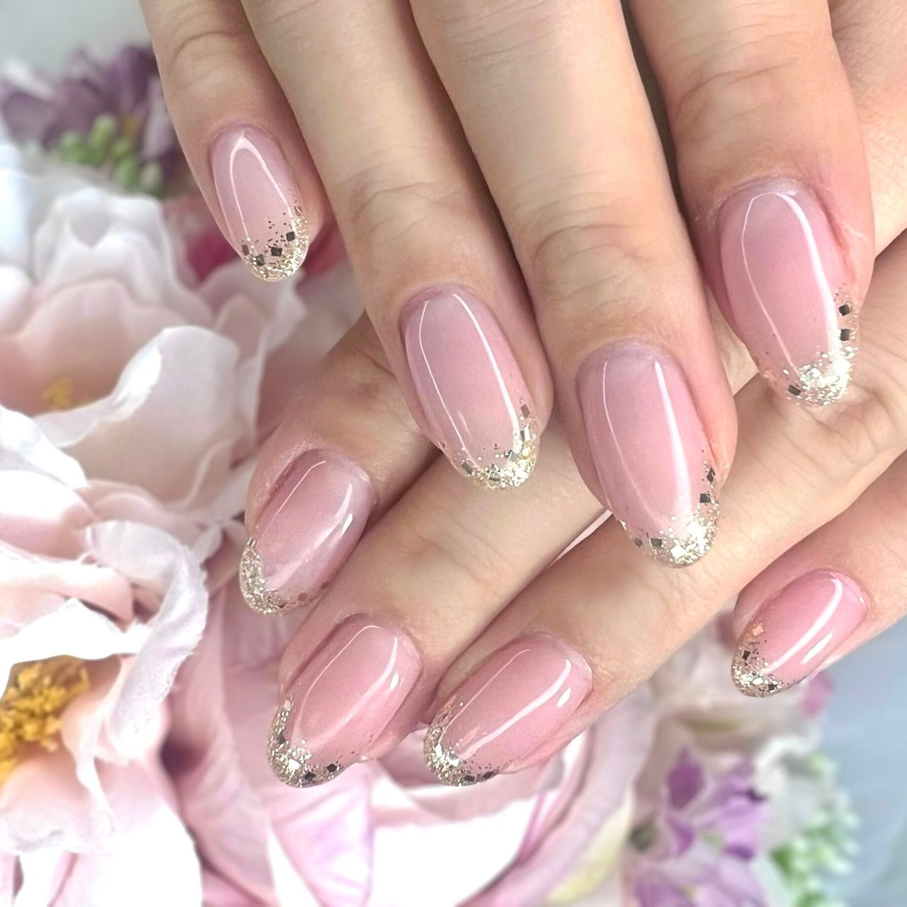 ヌーディーなピンクカラーをベースにゴールドのラメフレンチを施しました✨