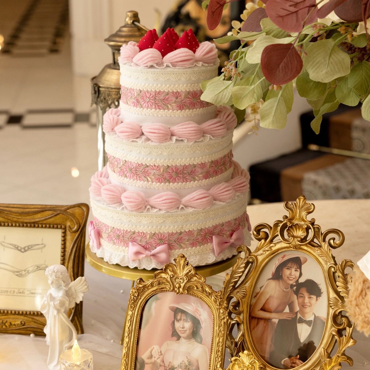 クリームの装飾が美しいロマンティックな3段のウェディングケーキです✨