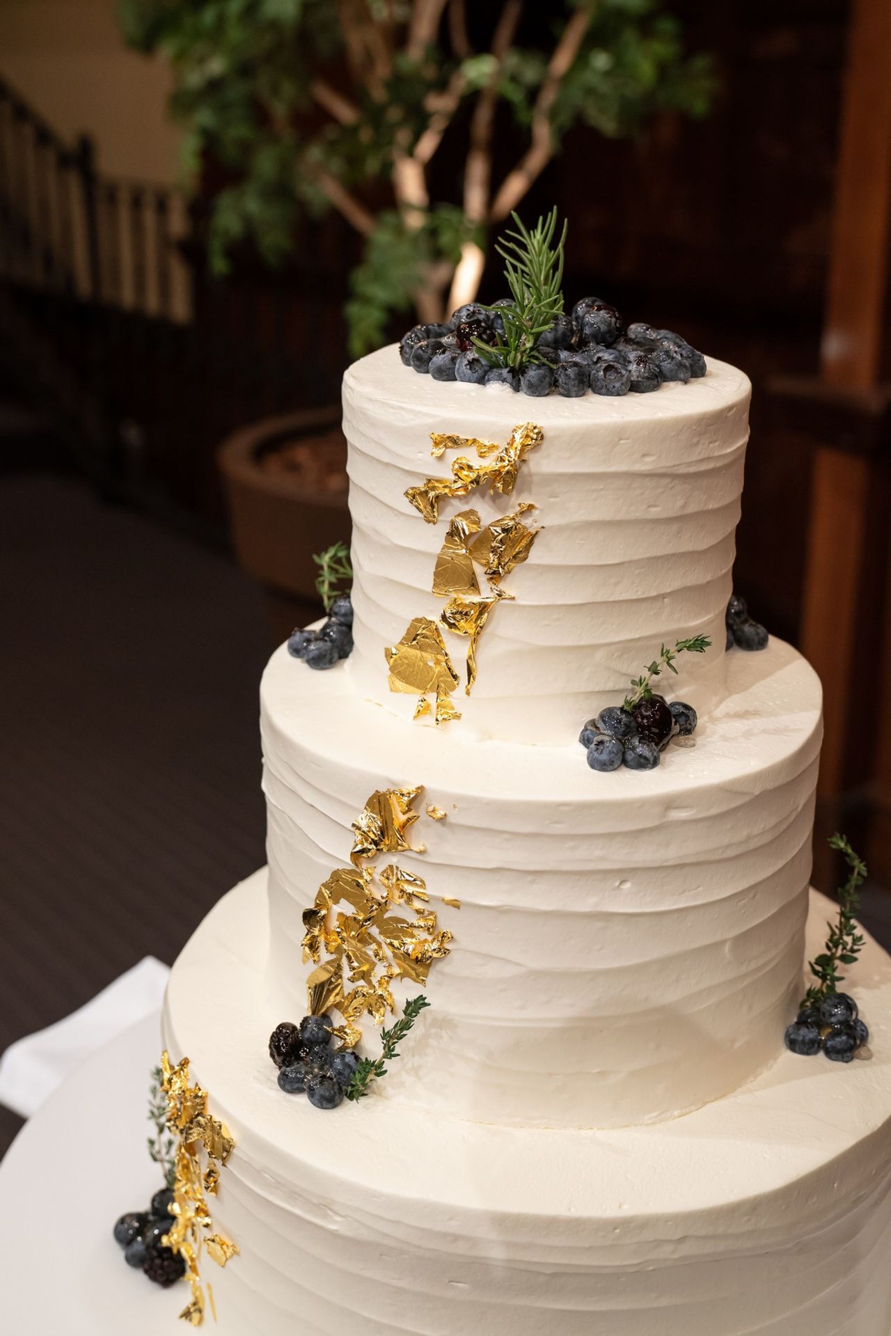 ケーキ入刀を和装で行うので、式場オリジナルデザインのケーキをベースに、金箔をつけていただくようアレンジしました。当日はフルーツもイメージ画像でお見せしたブルーベリーに変更していただき、とてもうれしかったです。