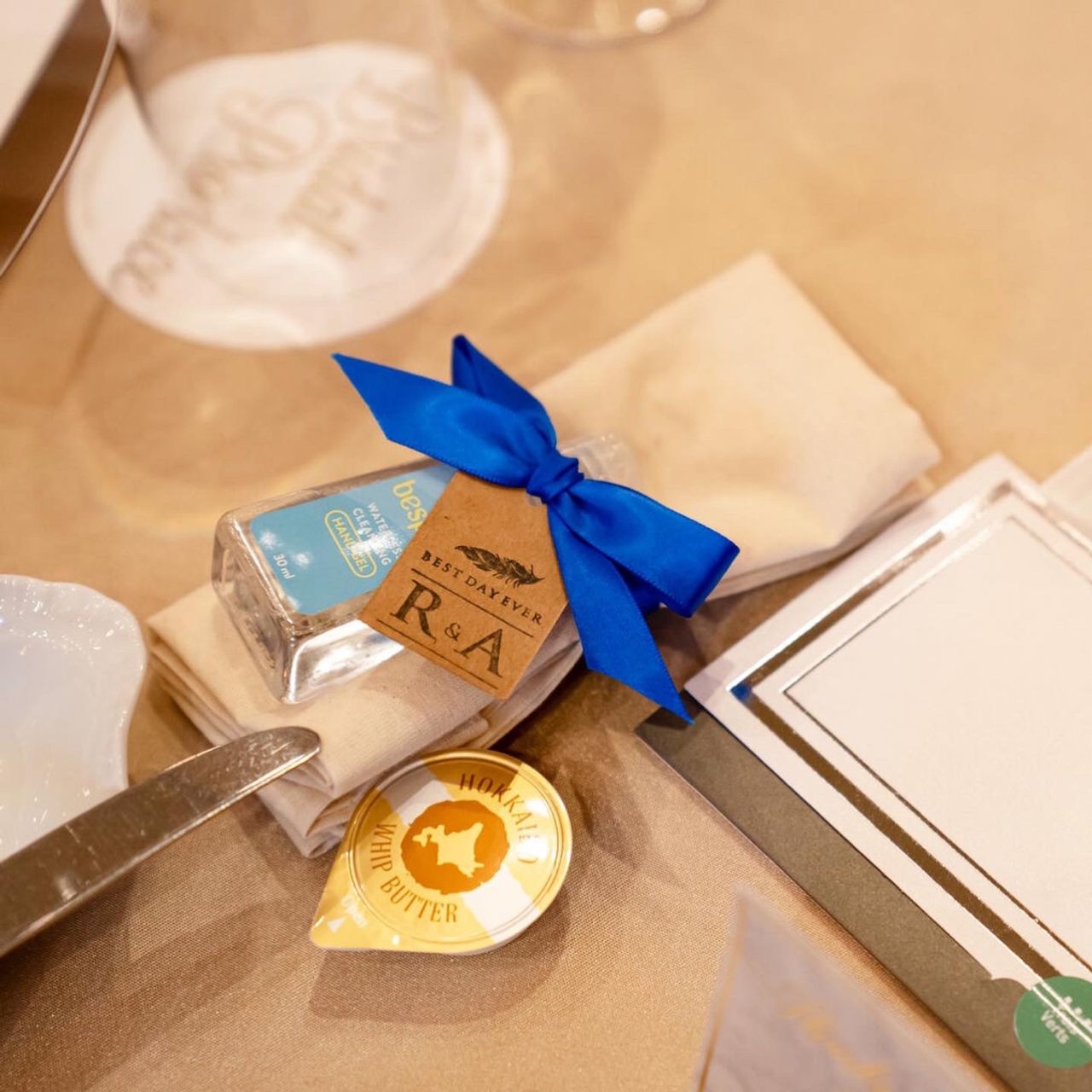 ウェルカムギフトとしてアルコールジェルと布バッグを卓付けしていただきました。