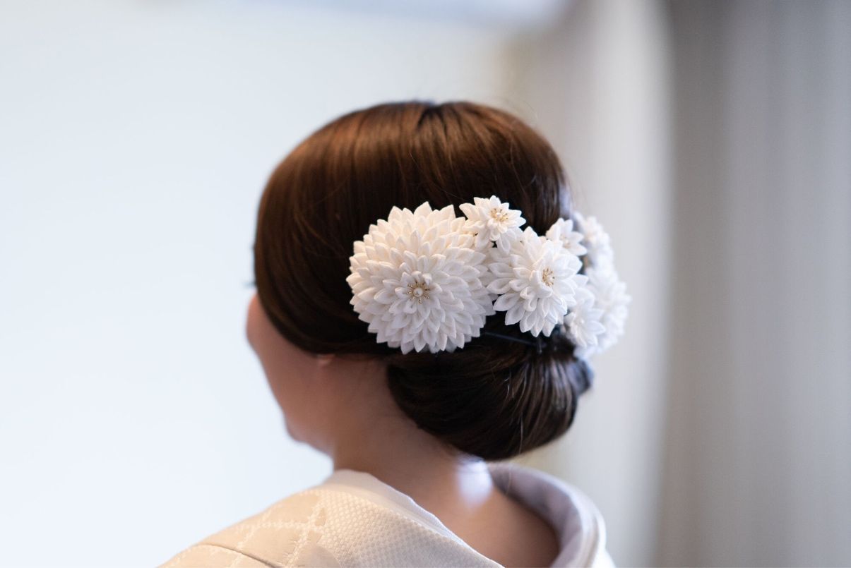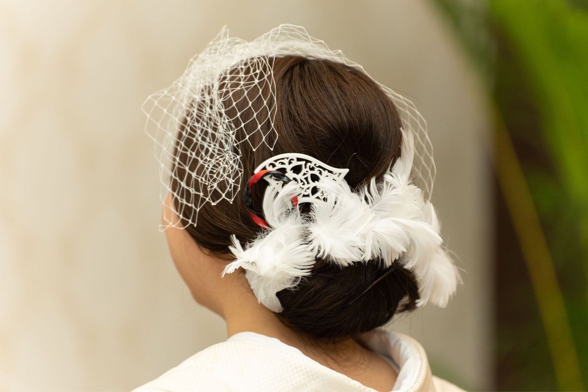 ファーストミート・ファミリーミートまでは綿帽子、挙式ではつまみ細工の花飾り、披露宴前半はバードケージのチュールと簪を合わせ、同じ和装でもテイストを変えるようにしました。