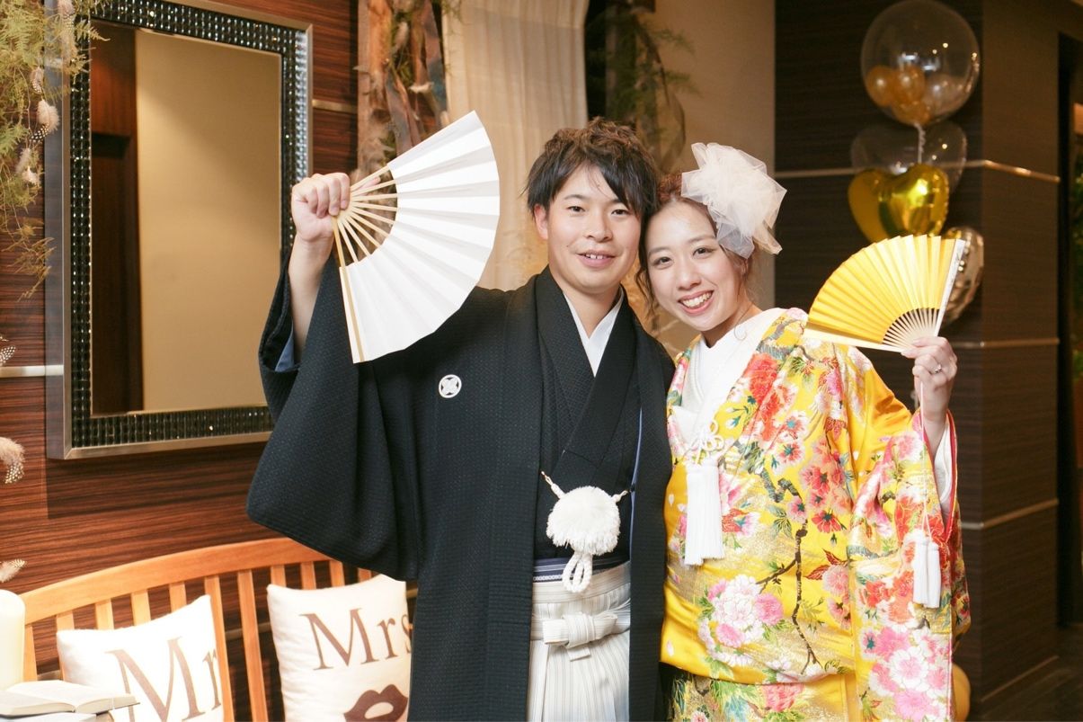 色打掛でよくみかける赤や緑は定番色なので、あまり他の人が着ていない色がいい!というのが希望でした。見本一覧を見せていただいて、黄色とゴールド、白地をそれぞれ試着して、しっくりきた黄色を選びました。