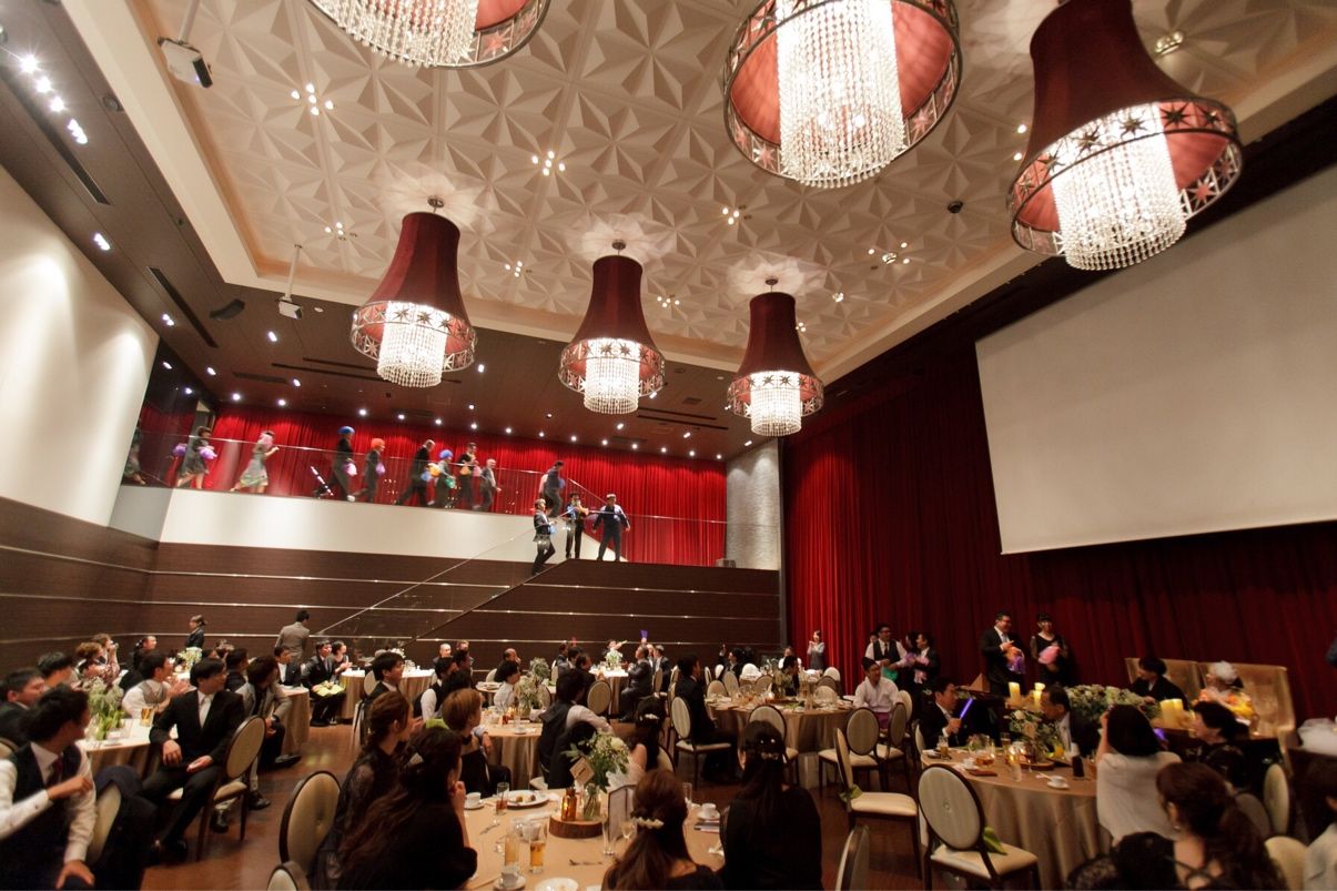 おしゃれなシャンデリアと高天井、三面スクリーンをフルに活用したこだわりの演出ができます。