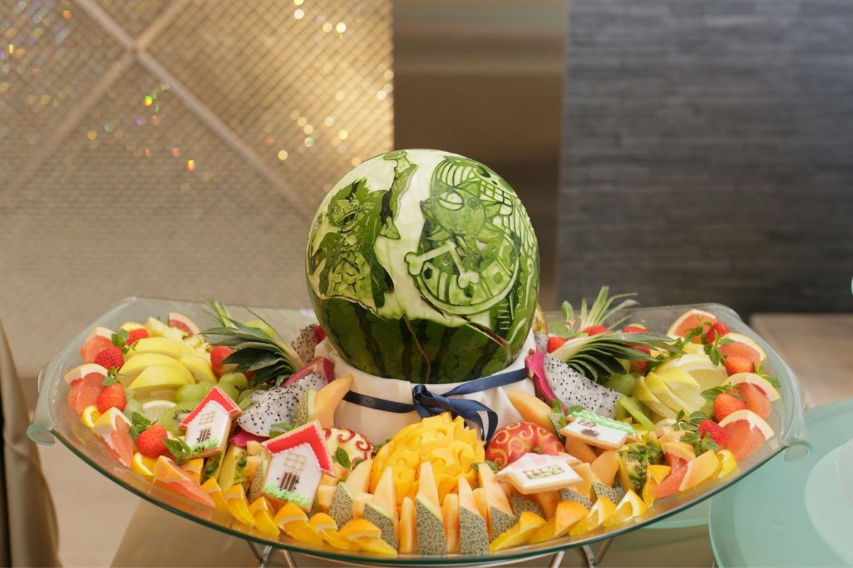 また、ビュッフェも取り入れました。建築関係の仕事をしていたこともあり、家型のアイシングクッキーを作っていただいたり、披露宴でONE PIECE要素を取り入れていたので、キャラクター風のフルーツカービングや悪魔の実を見立てて作ってくださいました。