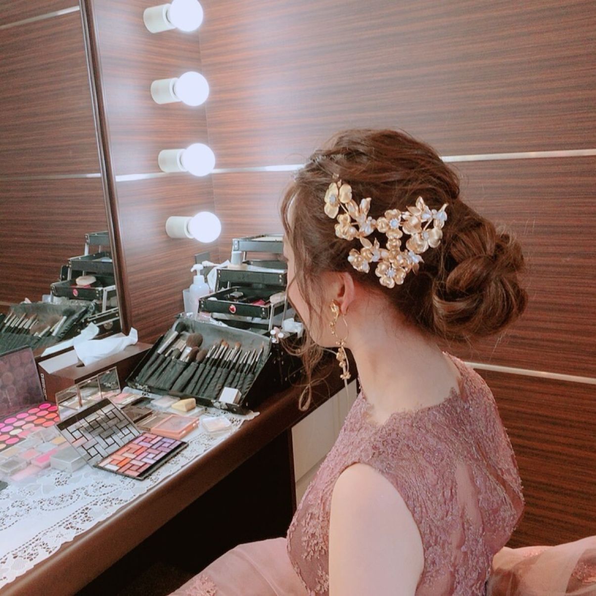 カラードレスは、アンティークゴールドのお花の髪飾りを付けました。